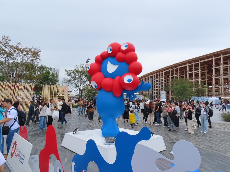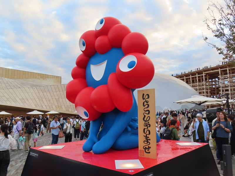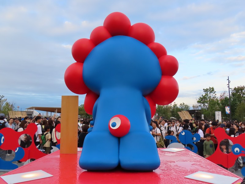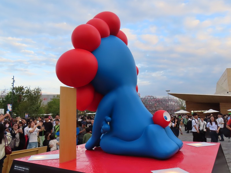 ミャクミャクに挨拶。真後ろからきっちり写真を通ったのは初かもしれない。尻尾にも目があるので、これは見られているということだね。たくさんの人が写真に並んでいて、相変わらずの人気者。さて、ではまた明日。