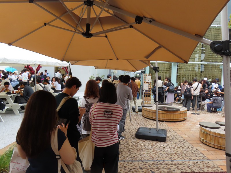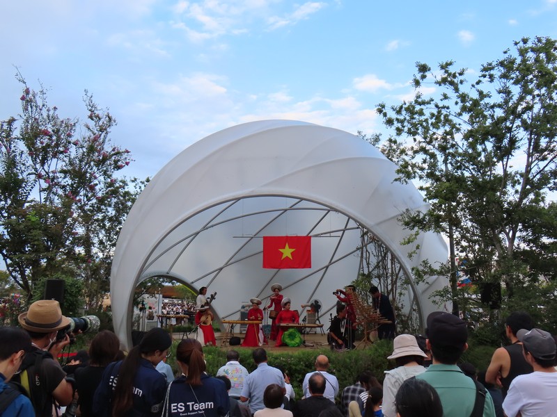 カフェで16:30のモンハンにチャレンジ、やっぱり撃沈。取れませんねえ。バーレーン館を出ると会場はさらに混雑してきたようで、ポルトガルレストランはテイクアウトまで大行列。まあ、今日はもう満足したかな。明日も来るので、今日はもう帰りましょう。東口に向かうとステージではベトナムの民族衣装を着た人たちが演奏準備中。少し音出しの様子が見えたので、まあいいでしょう。