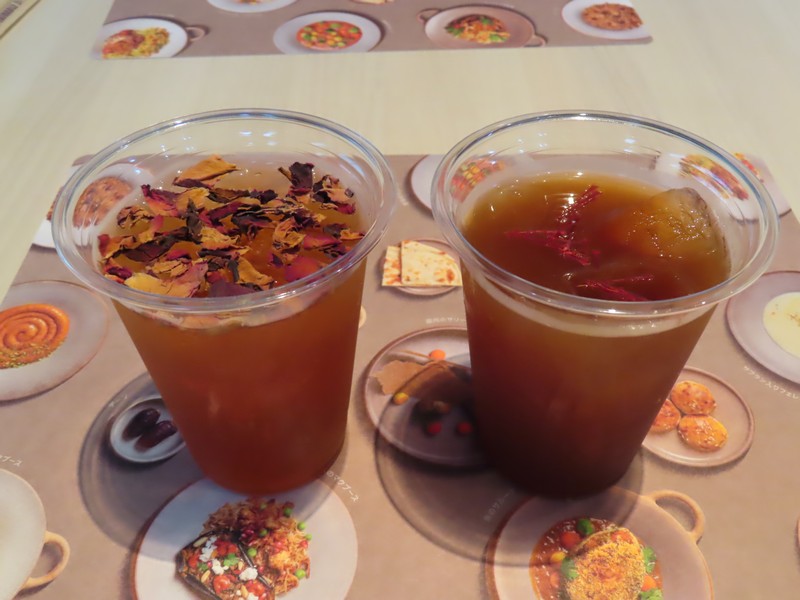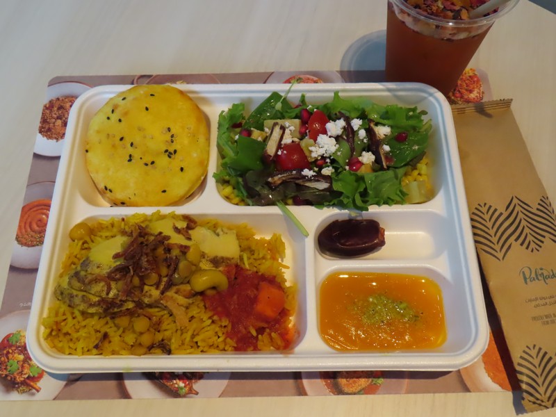 席に案内され、メニューはスマホ、注文はレジで。BENTO BOXからサラダ、メイン、デザートを選択。オーダーしたドリンク「リワの葉サブデーツシードのアイスドリンク(特産の完熟デーツを使用したコーヒー風味のカフェインフリー飲料」はほんのりデーツの甘味を感じられるコーヒー風味。「アイス・スリマニティー(UAE風スパイス「バザー」とローズウォーターをブレンドした、カルダモンとサフラン香る紅茶)」は中東らしいスパイスの風味が感じられるすっきりとした味わい。どちらも日本ではなかなか味わえないものですね。さあ、BENTO BOXが来たぞ。サラダは同じ「ハリース・サラダ」大麦・ザクロ・パセリ・ミニトマト・キュウリ・茶三―チーズが入っていて、このザクロがいいね。大麦の食感も楽しいです。メインは「ラム・ウージ(ラムのグリル)」と「ダジャジュ・マッチブース(チキンのグリル)」どちらもスパイスが効いていておいしい。ラムはほんのりラムの香りはあるかな。付け合わせのライスもしっかりスパイシー、でも辛いわけではないので食べやすい。そしてデザート「バティータ(ローストした小麦粉にデーツ、カルダモン、サフランをブレンド)」は粉っぽいがしっとりしていて甘さ控えめが悪くない。「アシーダ・ボバー(カボチャ、サフラン、カルダモンを使用したエミラティ風プディング」はカボチャの甘味あるねっとりしたペースト。独特の風味はカルダモン、これが中東感を出しているね。万博ならではの異国体験、おいしかったです。こういうのが楽しいなあ。