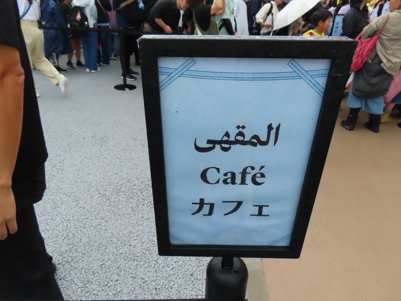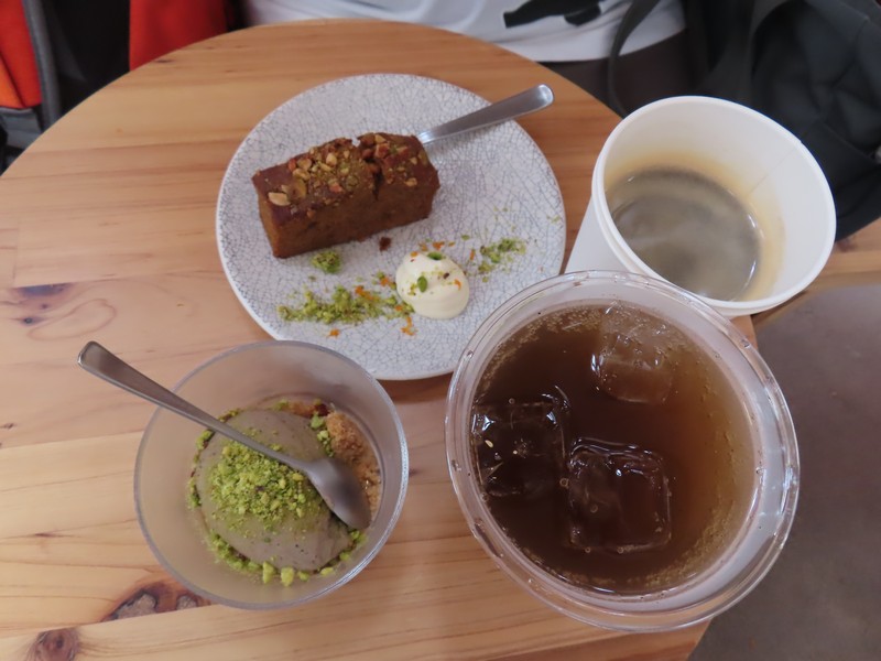 お茶でもしますか。まだ行っていないところということで、バーレーンのカフェに行きますか。パビリオンはかなり長蛇の列だが、カフェ列は数組程度。30分ほど待って中に案内されました。ダウ船をイメージした館内の壁際に一列に並ぶテーブル、結構小さめだな。カフェなのでこれで十分だね。ドリンクはコーヒーとルメーソーダ。ブラックライムを使った炭酸飲料とのことで、ほんのり薬膳のような独特な風味があり、甘酸っぱさの中に苦みもありと、さわやかな味わいだ。そのお供、まずはデーツケーキ、もっとデーツ感があるかと思ったが少しデーツ風味くらいかな。クリームとピスタチオを合わせておいしいです。ルメ―アイスクリームはアーモンドシュガークランブル添え、さっぱりした甘味の中に苦みありと、ルメーソーダと合わせていただきます。今日はUAEからバーレーンの中東フルコース。異文化体験、万博だなあ。