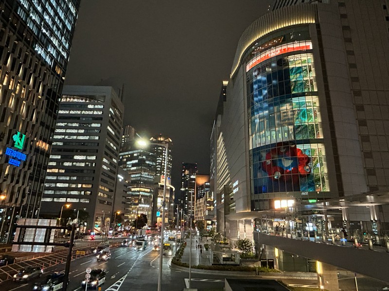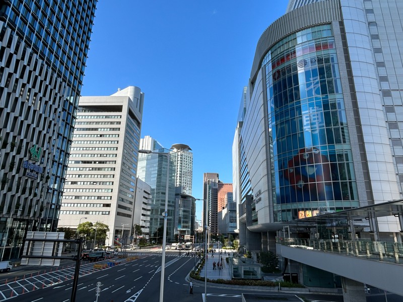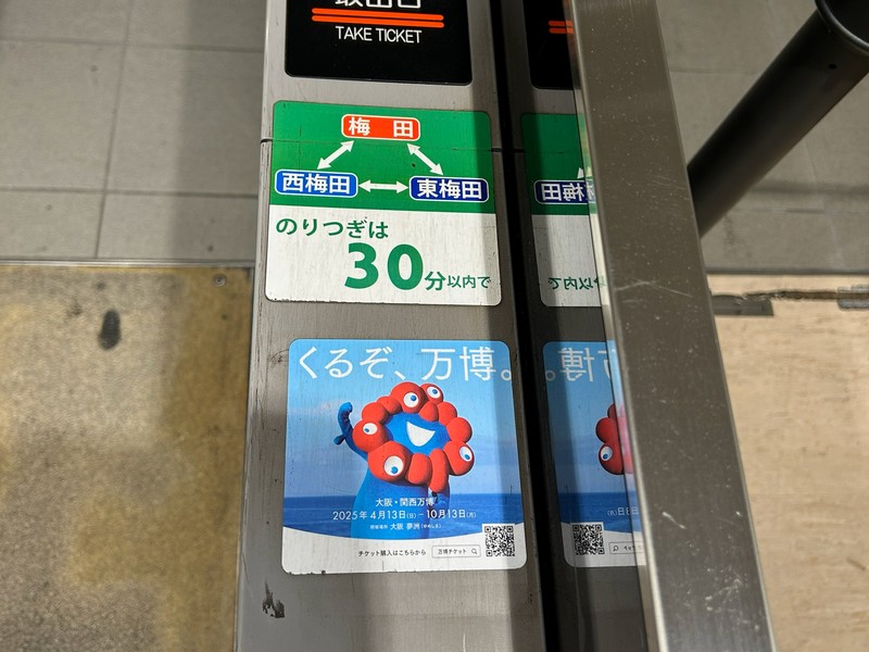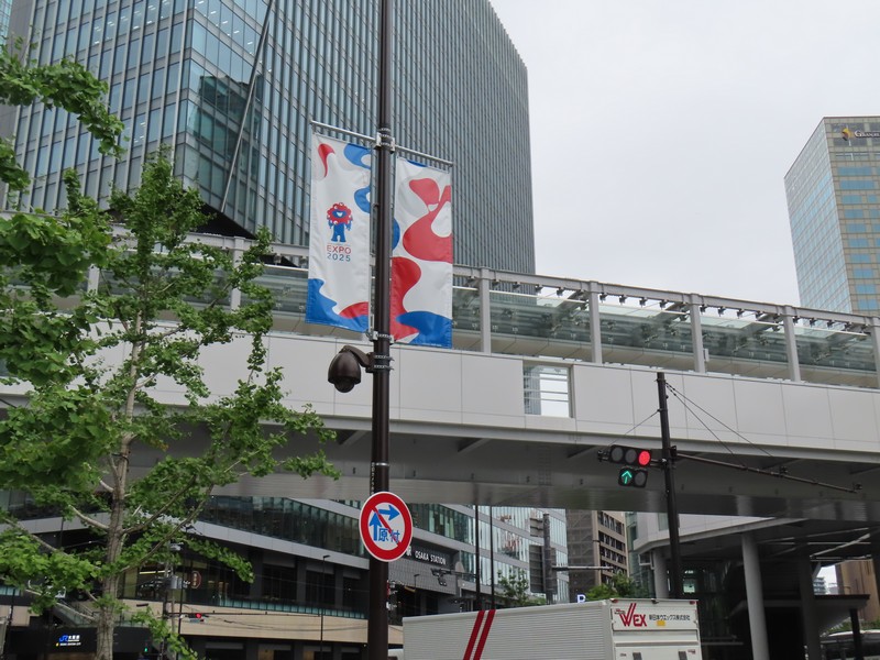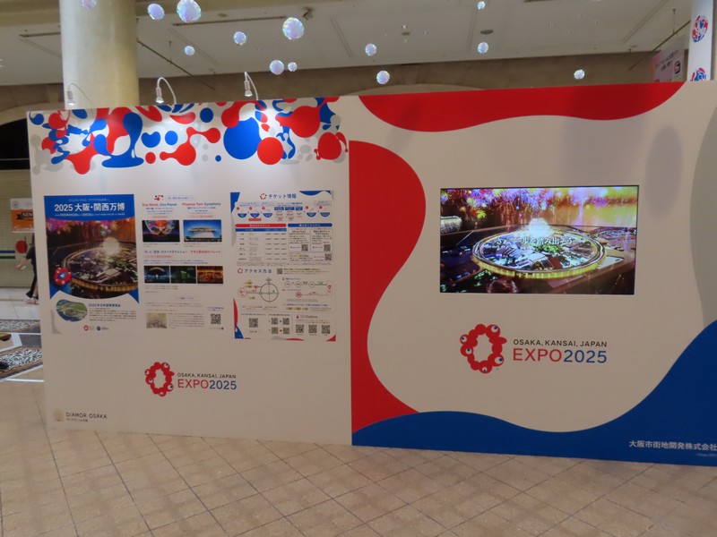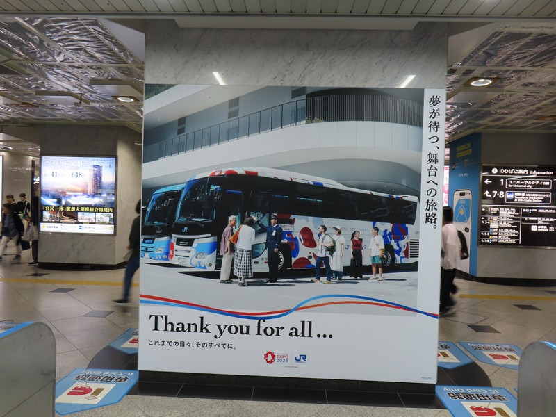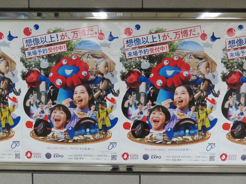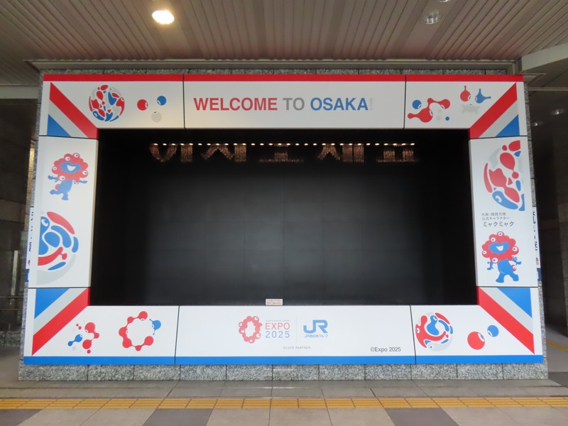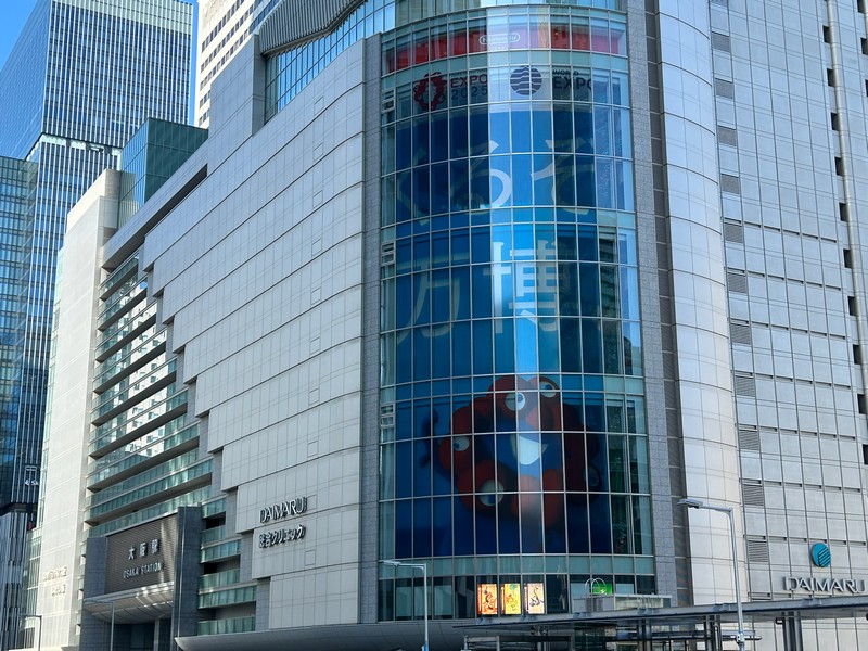 大阪駅の一部ともいえる、大丸梅田店。ここの外側、阪急阪神をつなぐ歩道橋から見ると「くるぞ万博」の力強い文字とミャクミャクの姿が。ちょっと光って見えづらくもあったが、開催前からずっとここにいたんだね。あまり通るルートではなかったこともあり、これを撮ったのは閉幕翌日。まだぎりぎり残っていてよかった。