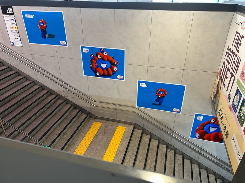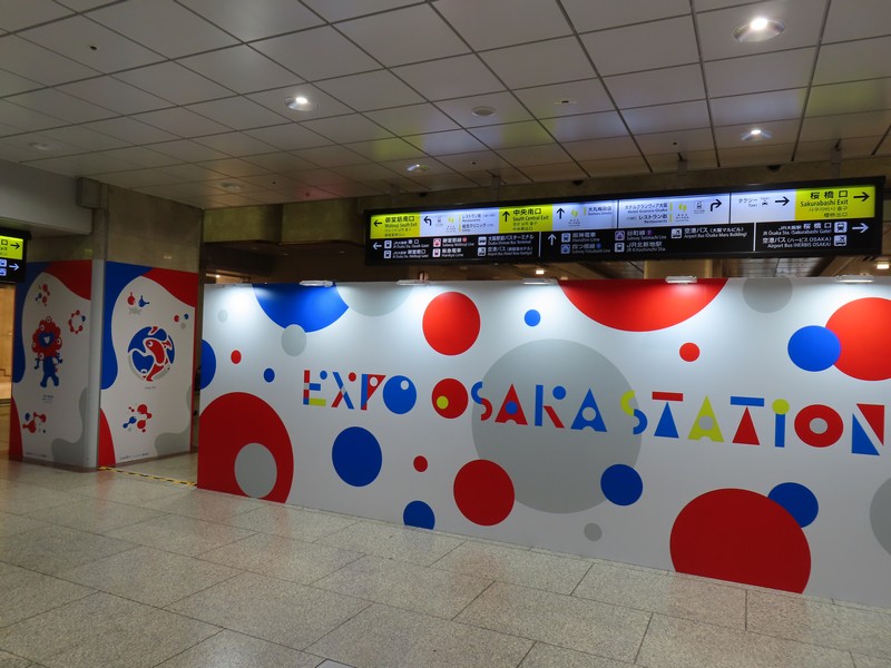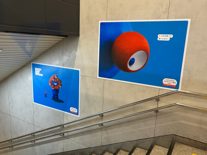 まずは大阪駅。やはり玄関口となる駅だけあって、あちらこちらに万博テーマカラーがあふれている。大階段の大屋根リングとミャクミャク、ここまで人がいないタイミングは奇跡的。10/12、閉幕前日の早朝でした。この万博以来、赤と青の様々な形が集まっているとそれだけで万博風、ミャクミャク風に見えてしまいます。