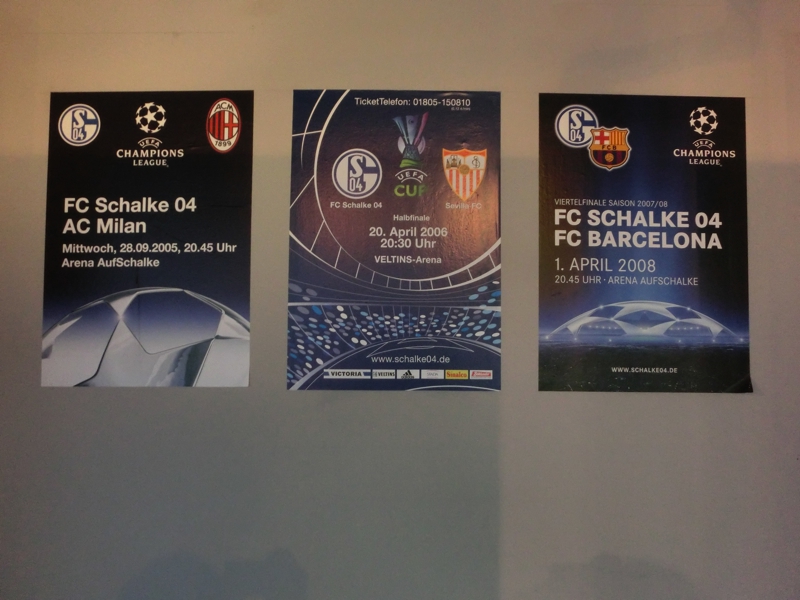 ミュージアムはシャルケが創立した110年前からの新聞記事や写真、栄光のトロフィーや数々の試合の記録など展示されていて、ドイツ語は分からないが見ているだけで面白い。ブンデスリーガを制覇したこともある一方で2部降格もあり、いろいろな苦難もあったようだね。ここ数年の展示はないので残念ながらこの中で内田の姿を見ることはできなかったが、何年かたって新たな展示がされるときにはここに紹介されるような選手になってほしいものです。シャルケファンの部屋をイメージした小さな部屋があり、壁全面にシャルケグッズが飾られていました。実際にこんな人もいるんだろうな。奥まで行くと、スタジアム内に張り巡らされているフェルティンスの生ビール管についての説明されている。明日は飲むぞ~ざっと一通り見たので、受付近くでちょっと休憩。飛行機でもらったどら焼きで栄養補給だ。