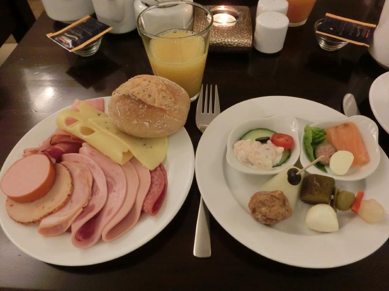 初日は時差ぼけでいつも通り3時ごろに目が覚め、その後は日記書きなどしながら過ごす。5時を過ぎ、隣も起床。シャワーを浴びてさっぱりし、7時過ぎに朝ごはんへと向かう。ロビー横にある朝ごはん場所へと行ってみると、これはすごい。ほとんどトップバッターであるのでまだきれいにそろっているのだが、ハムやチーズの充実ぶりはもちろん、ちょっとしたおかずがいい感じ。サーモンだったりサラダだったりが小さな器に入っていて、何種類もある。これはいいなあ。一通り食べようと思うとかなりの量だぞ。でもせっかくなのでいろいろといただきましょう。さらに卵料理もいただけるので、ここはシンプルに目玉焼き。少しのパンとたくさんのおかず、いいですねえ。おかわりもして、ピクルスやキッシュなども少しずついただき、ほぼ全種類をいただきました。デザートにはヨーグルトを頂き、大満足の朝ごはん。ごちそうさまでした。
