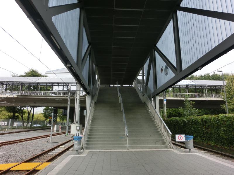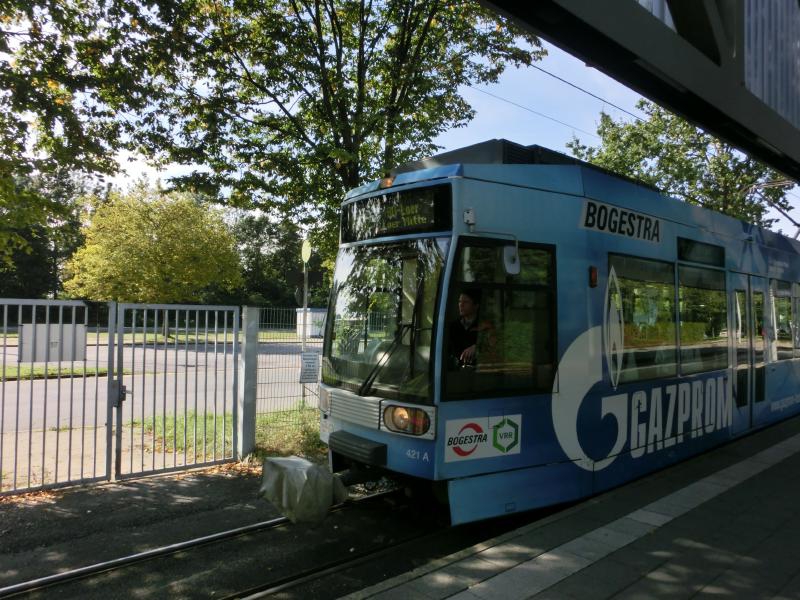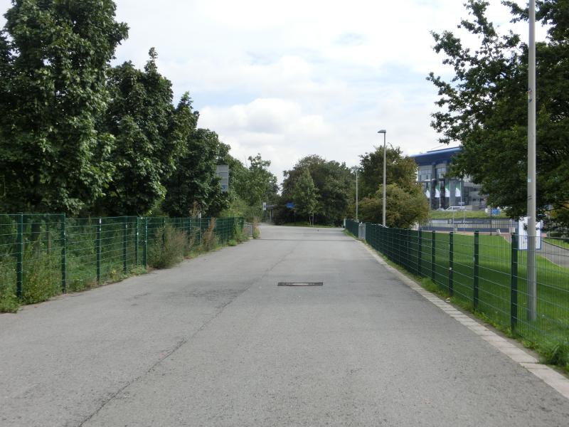 スタジアムに行くには、駅の地下にあるトラムにのっていけばいいので、さっそくチケットをゲットし(5E)、ホームへと降りる。すると、駅の係員のような人がいて、どうもトラムは走っていないと言っているようだ。代替でバスがあるとのことで、とりあえずそのバス停まで案内していただく。その1番乗り場で202のバスを待てばいいといわれるが、そのバスがいつくるのかよくわからない。しばらくして1番乗り場に番号の表示していないバスが来たのでバス乗り場の係員に聞いてみると、どうやらこれでよさそうだ。それにしてもスタジアムの「フェルティンスアレーナ」がそんなに通じにくいものかな・・・このあとどうすればいいのかがよく分からないが、係員に聞いても運転手さんに聞いても出てきた「ケネディプラーツ」をキーワードに、取りあえず乗りましょう。しばらく走ると、バスはケネディプラーツ駅に到着。ここでお客さんはみんな降り、すぐ横にあるトラム駅にみんな向かう。そうか、ここからはトラムが走っているんだな。ストなのか工事なのか分からないが、とにかくゲルゼンキルヒェン駅のあたりは動いていないが他は動いているということで、トラムは出発。これで一安心だ。10分くらい走ると、窓からスタジアムが見えてきたぞ。そして無事に、フェルティンスアレーナ駅に到着。今日はがらんとした駅だが、ここが明日にはサポーターでいっぱいになるんだろうな。駅からスタジアムに向かう道も、今日はがらがら。こんな様子も写真に収めておきましょう。