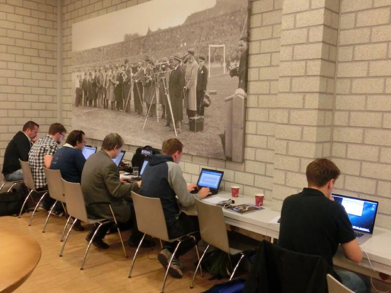 このあとは下に降り、スタジアム内のチャペルなどを見学。本当ならばここから選手のロッカーや通路、ベンチなどが見学できるはずが、明日の準備のために今日はできないとのこと。そうか、それは残念だなあ。清掃の方が通るときにピッチにつながる通路がちらっと見えたが、ここも炭坑をイメージした感じの通路になっていました。また次の機会があれば見たいものです。そのあとはさらに下に降りて、メディアセンターへ。記者会見が行われる場所で、明日に備えて記者の方々が原稿書き中。どんな試合になるかな。ここでは例によって、おきまりの記者会見席へ。マイクの回りにはスポンサーのフェルティンスビールが置かれ、まさに本番イメージ。ここで内田も記者会見をしたわけですね。こうして1時間ちょっとのスタジアムツアーが終了。お疲れ様でした。