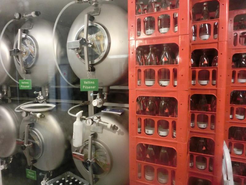 続いてスタジアム内に入る。がらんとしたところだが、ここが明日はいっぱいになるのだろう。ショップがあるので、ビールやソーセージの値段はチェックしておきましょう。この天井にはたくさんの管が走っているのだが、黒い管はビールが通る管。たくさんあるショップでどこでもおいしい生ビールをいただけるのは、この管のおかげです。壁には何の変哲もない扉があり、その中には巨大な生ビールのタンクがありました。とにかくビール、ドイツらしいです。