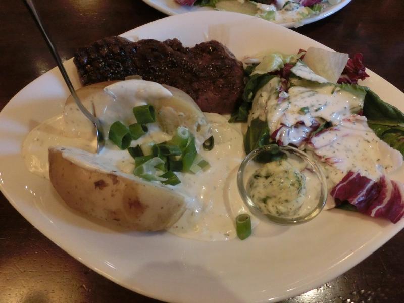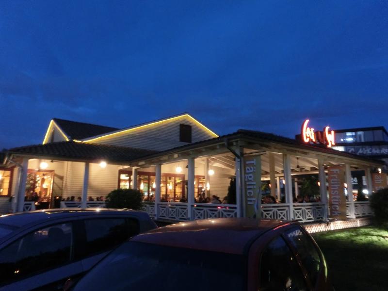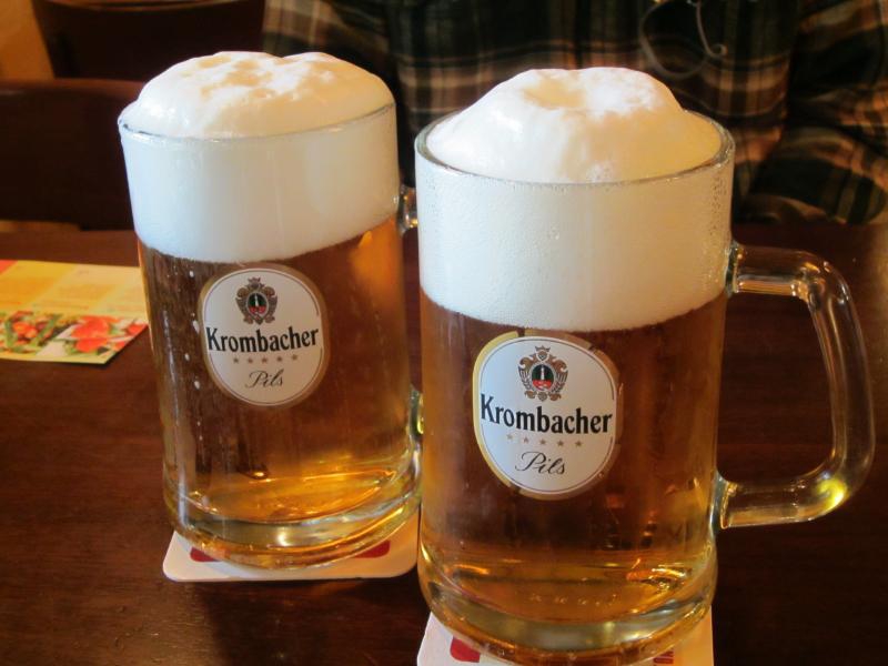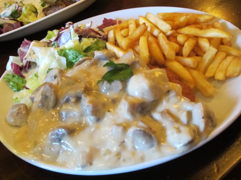 ホテルから数百メートルほど歩いたところにあるこのお店は、いわばドイツ版のファミレス。お客さんも結構入っているようだ。席に案内され、メニューを見る。うん、やっぱりファミレスっぽいな。肉が食べたいのでビーフステーキを頼み、もう一つはシュニッツェルのマッシュルームソース。どんなのか来るかな。何はともあれビールで乾杯だ。しばらくしてやって来たものは・・なかなかのもの。ステーキそのものはともかく、サラダにかかったたっぷりのドレッシング。シュニッツェルには、大量のポテトフライとマッシュルームソース。食べてみると・・どちらもうまいのだ。確かに旨いのだが、とにかくドレッシングやソースがかかりすぎ。ここまでかけなくてもいいのに・・と思いながらも、結構食べてしまいました。そりゃ身体が大きくなるわけです。食後にカプチーノを頂き、ごちそうさまでした(45.3E)。