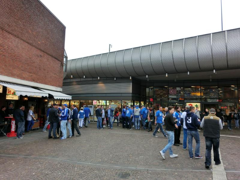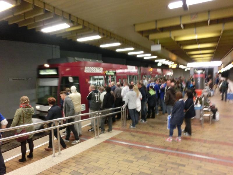 部屋にもどって荷物を置き、出かけましょうか。駅前にはさらにシャルケユニの人が増えていて、どんどんとにぎやかになっている。この雰囲気、いいですねえ。2時を回ったので、昼ごはんかな。昨日も行ったソーセージ屋さんに行こう。今日もにぎわっているが回転が速いのですぐに順番が回ってきた。日本ではありえない太いソーセージのと、基本的な焼きソーセージのをゲット。どちらもマスタードをつけて食べる。うまいねえ。ソーセージそのものもうまいが、なによりこのパンがうまい。歯ごたえがしっかりしているのと、香ばしい小麦の香り。実にうまいです。お昼ごはんとしてはこれで満足、そろそろ行きますか。昨日はこの駅付近では動いていなかったトラムだが、今日は無事に動いているようだ。よかった。駅はすでに人でいっぱいで、ちょうど来たトラムにたくさんの人が乗り込んでいる。試合の日は、観戦チケットを持って入ればトラムが無料になるのがうれしいサービス。ではスタジアムに向けて出発だ。