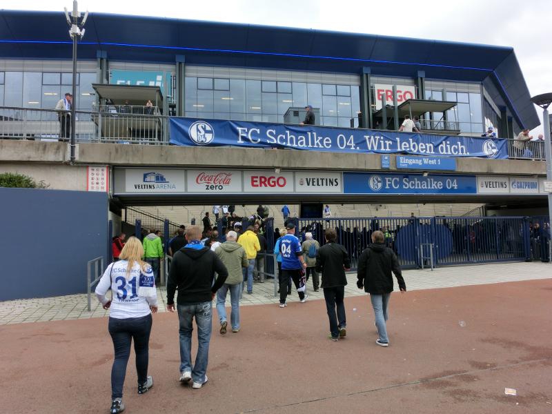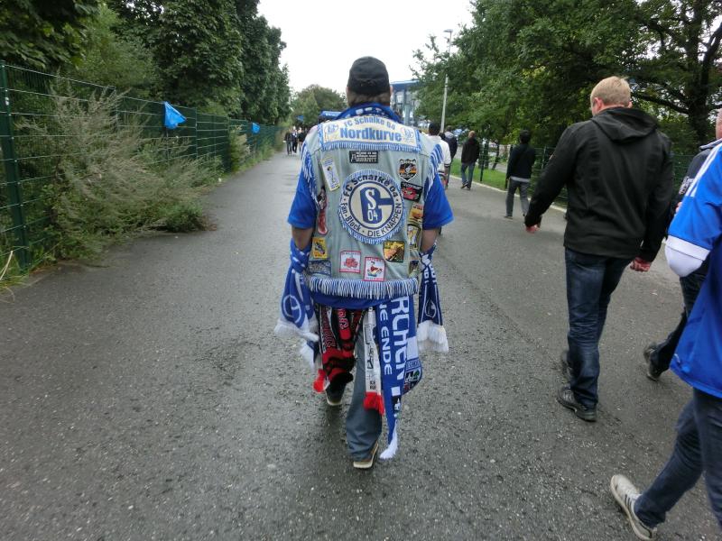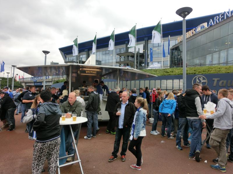 さて、応援スタイルが完成したところで行きますか。取りあえずゲート前に戻ると、さっきよりもたくさんの人たちがビールやソーセージを楽しんでいた。結構歩いて喉が渇いたので、やっぱりビールだね。屋台でVeltinsの生ビールをゲットし、試合前のにぎやかな雰囲気を楽しむ(7.8E)。よく見ると、青い中にぽつぽつと赤い人がいるのはバイエルンミュンヘン。でもやっぱりここはシャルケホームなので、ほとんどが青いシャルカーだね。でもバイエルンは野球でいうと巨人のような存在なのかな。ビールを飲み干したところで、そろそろ行きますか。ゲートを入ると、セキュリティチェックでは思った通りペットボトルの水が指摘されました。残りもそんなにないのでその場で飲むが、やっぱり持ち込みたいよね・・・でも仕方ない。