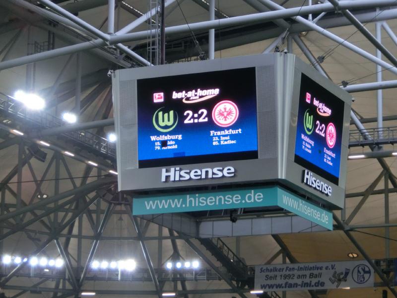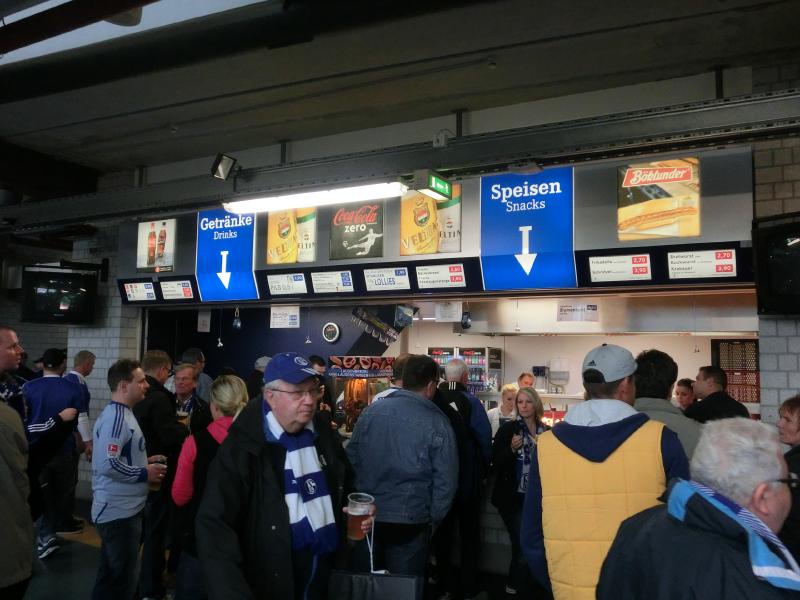 座席はS1というエリアなので、ちょうど昨日のスタジアムツアーの集合場所あたりだ。いよいよだな。座席に向かう通路から入ると、そこには緑のピッチが広がっていた。まだキックオフまで1時間以上あるので観客の入りは今のところそれほどでもないが、ゴール裏のホーム自由席とすぐ近くのコーナーに設けられたアウェイ自由席、ここにはすでにたくさんの人が入っていて応援合戦が繰り広げられている。アウェイ席はすぐ近くなのでなかなかの迫力だが、試合が始まるともっと迫力出てくるんだろうな。しばらくすると、他球場の結果や途中経過がセンターサークル上にある巨大なモニタに表示された。よくみると、フランクフルトでは乾のゴール、ケルンでは大迫のゴールがあったようだ。日本人もがんばっているなあ。ドイツだけでなく、ヨーロッパでもっともっと活躍してほしいものです。さて、今のうちに腹ごしらえをしましょうか。