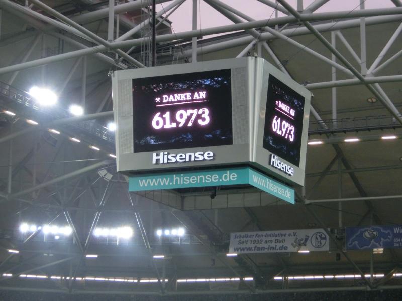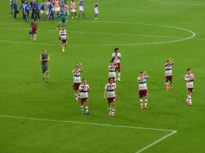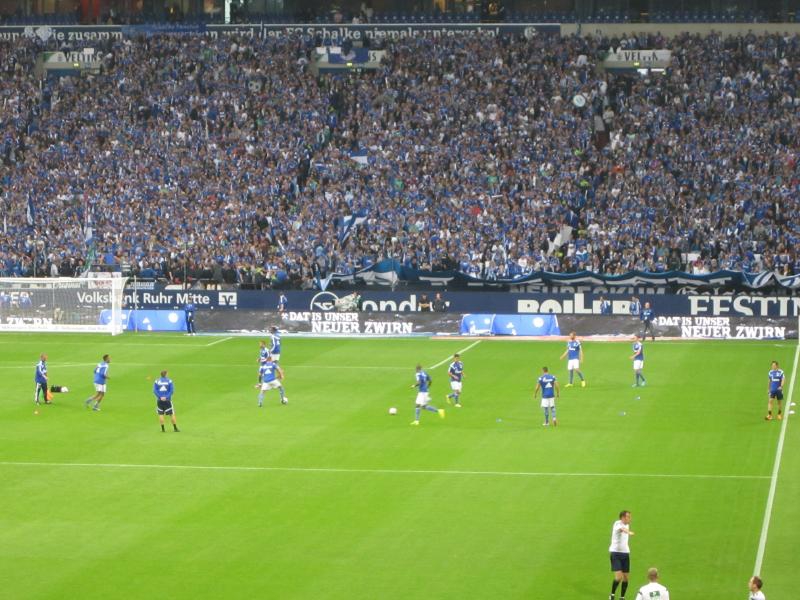 何はともあれ、とにかくシャルケにとっては相手がバイエルンなので引き分けでも十分なので、悪くてもこのまま終わりたいところ。それぞれチャンスは訪れるものの結局この後はゴールはなく、1-1で終了。無事に引き分けで終了できたとのことで、スタジアムは喜びの歓声に包まれた。バイエルン側はやっぱり勝ちたい試合だったようで、静かに撤収の準備をしていました。この試合、観客は61973人。すごい数だなあ。サッカー熱の高い地域だとは聞いていたが、想像以上に熱狂的なファンがたくさんいるんだね。シャルケの選手たちはピッチを一周し、観客の歓声に応えている。エルヴィン君も一緒にね。