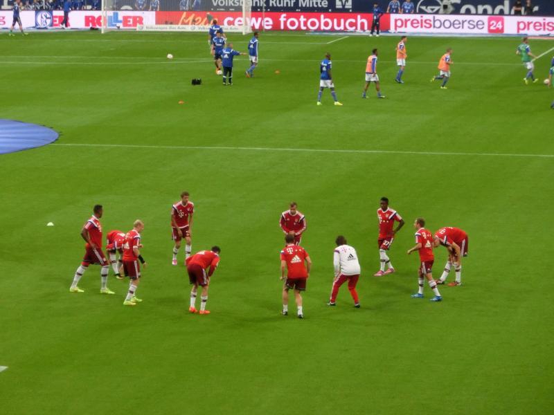 観客席に戻ると、ピッチでは試合前のウォーミングアップが始まっていた。青い中に、やっぱり内田は見あたらないなあ・・・残念だが仕方がない。手前にはバイエルンの選手たちがいるが、ミュラーにラーム、ゲッツェの姿が見える。いつの間にか、シャビアロンソもバイエルンなんだね。リベリにロッベンは怪我らしく、残念だな。でもキーパーにはノイアーもいるし、本当にワールドクラスの選手が揃っている。そのバイエルン相手に、シャルケがどこまで戦えるか。特に開幕初戦を落としているので、この試合は重要だ。しばらくすると、今日の先発メンバー発表が行われた。バイエルン側はポーランド代表レヴァンドフスキ、スイス代表シャキリ、ドイツ代表ボアテングなども出場する錚々たるメンバー。対するシャルケは、内田が出ないと正直なところ誰もわからない・・・今回はバイエルンが相手ということでチケット確保が大変だったが、結果としては知っている選手がたくさんいてよかったかもね。