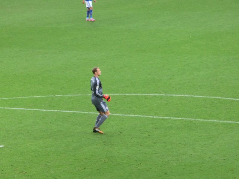 さあ、後半が始まる。後半はわれわれの席側にシャルケは攻めてくるし、ゴール前にはノイアーがいるし、しっかり楽しませてもらいましょう。途中の選手交代などがあり、後半17分に緩やかなフリーキックから、ゴール前で折り返したチュポモティングのシュートをシャビアロンソがクリアするも、そのボールがヘーヴェデスに当たってそのままゴール。リプレイを見るとハンドかどうか微妙なところで、ノイアーが審判に抗議をしていたが認められず、シャルケが追いついた。スタジアム全体が歓声に包まれている。そう、やっぱりホームチームのゴールが決まるとこんな雰囲気を楽しむことができるんだね。そのゴールの直後、バイエルン側のサポーター席から何かがシャルケ側のサポーター席に飛んでいったが、おそらくドリンク入りのカップ。それはダメでしょ。こんなカップが飛んでいくようなら、やっぱりペットボトルは持ち込み禁止になるよね。