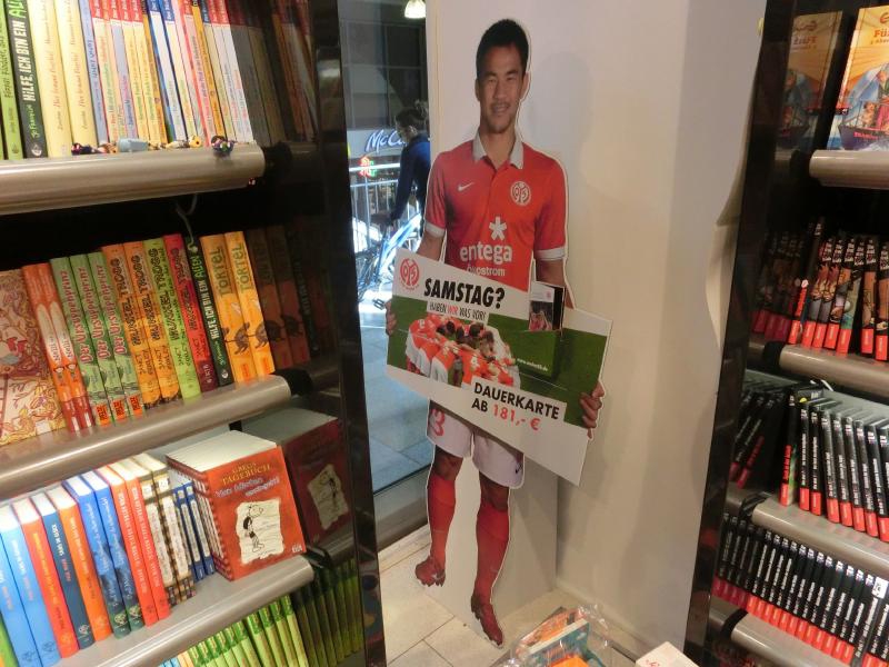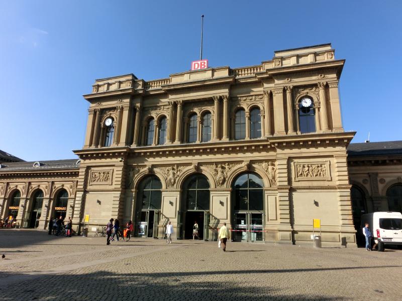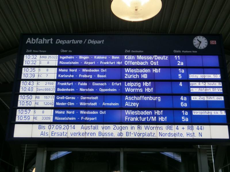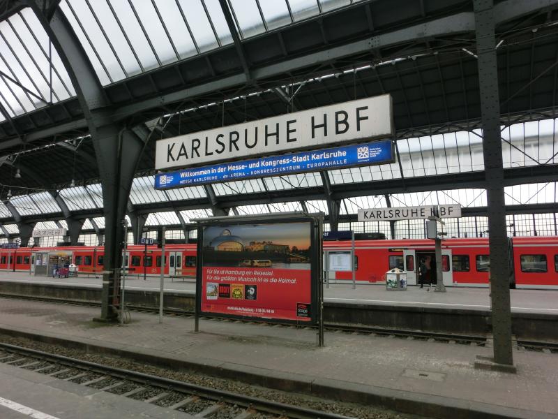 まだまだ時間がある。昼ごはんのサンドイッチでも買いだそうかと思って何軒かお店を見てみたが、今ひとつピンと来ないなあ。ちょっと大きめのキオスクに入ると、雑誌コーナーのところに岡崎の等身大パネルがあり、マインツのシーズンチケットの広告らしい。こういう広告になるということは、マインツの顔になっているということだよね。昨日は残念だったが、もっと点を入れてほしいな。一通りお店も見たし、ちょっと疲れてきたのでホームで待ちますか。もう本来の出発時間は過ぎているのだが、遅れ時間は相変わらず50分と出ている。そしてしばらくして見てみると、遅れ時間が60分に変わっていました。うーん、早く来てくれ~~・・・11時40分を少し過ぎた頃、ようやく目的の電車が到着。結局約65分遅れというわけですね。早速乗り込み、座席に着く。ふう、ほっと一息だ。電車はすぐに出発し、ようやく落ち着けるぞ。出発してしばらくして、係の人が回ってきた。検札かな、と思っていたら、なにやら申込書のような用紙を渡された。早口の説明を聞き取った限りでは、電車が遅れたのでどうやら特急料金の払い戻しがあるらしい。チケットを購入したクレジットカードに料金が戻るように聞こえたのだが、あとで用紙をよく見るとクレジットカード番号を書く欄はなく、ドイツ内の銀行口座を書く欄しかない。となるとどうしようもないよね・・・電車はその後はスムーズに走り、乗り換えの駅・カールズルーエに到着した。