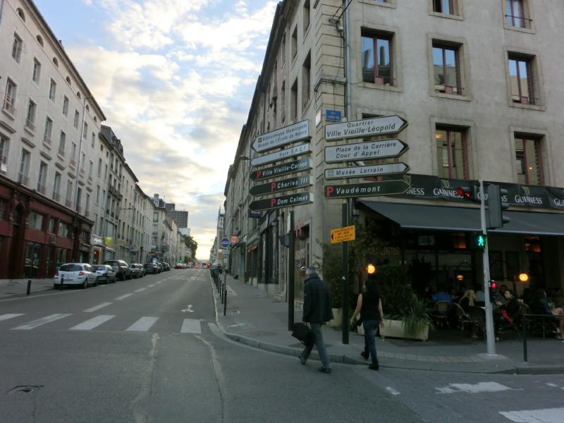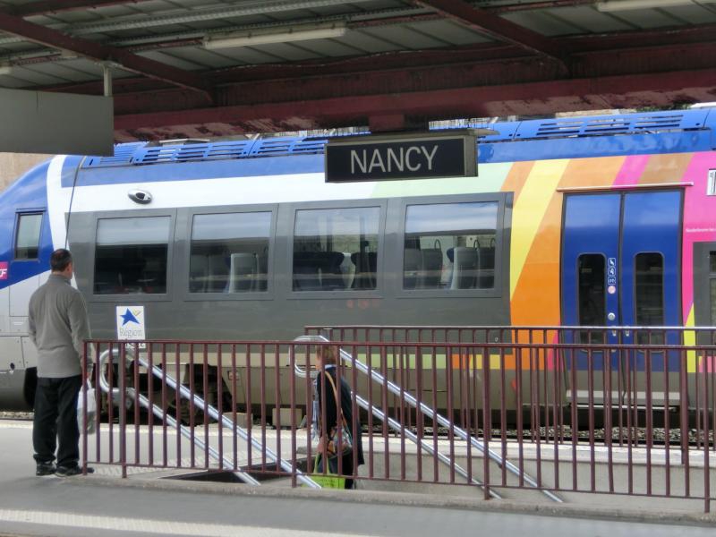 ストラスブールには定刻に到着。そういえば、いつの間にかフランスに入っていたということですね。まったく気づかない国境越えでした。ここの乗り換え時間は9分しかないので、さっさと動きましょう。ローカル列車のホームに行くと、アルザス地方のローカル列車が停まっていた。車体にはコルマールやストラスブールなどの地名と路線図のイメージが描かれている。時間も無いので早速乗り込むと、中は少々クラシカルな感じ。この時間はすいているのかな。ナンシーまでの旅、車窓を見ながらのんびりと過ごす。そして定刻通り、約40分ほどで到着だ。マインツ発が遅れたときはどうなるかと思ったが、結局は予定通りナンシーに着くことができました。よかった。駅前は工事中でスーツケースではちょっと歩きづらいが、まずはホテルへと行きましょう。ちょっと分かりづらかったが無事到着し、チェックイン。言葉がドイツ語からフランス語に変わったぞ。ドイツ語はほとんど理解不能だったが、フランス語ならホテルのチェックインくらいならなんとかなる。これだけでもちょっと安心だよね。内装をリニューアルしたらしいこのホテルは、部屋に入るとヨーロッパでは珍しい日本風の機能的なデザイン。ハンガーの位置とかテレビの位置とか、日本のビジネスホテル風だな。少し休憩して、街歩きへと行きますか。