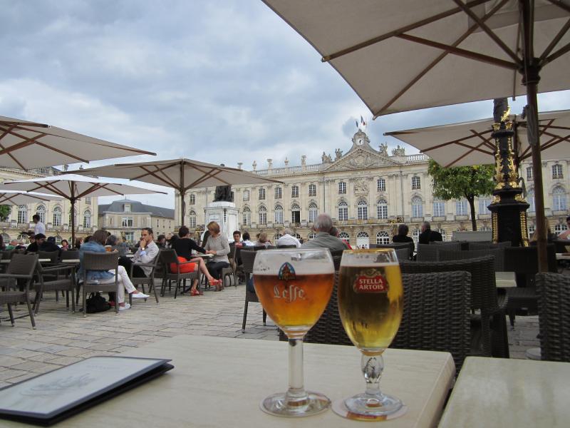 では街歩き再開。そのまま歩いていくと、突き当たりには金色の門がある。そこから入ると、そこはスタニスラス広場。世界遺産にもなっている広場だ。一辺が100メートルはあろうかという広場の真ん中に、スタニスラス公の銅像がある。これまで知らなかったが、スタニスラス公とは18世紀にこのロレーヌ地方を統治した人らしい。銅像ができるくらいなので、功績を残した人なんだろうな。その像の周りを取り囲むように市庁舎やオペラ劇場、ナンシー美術館などが建っている。それらの前にはいくつかカフェがあり、たくさんの人がゆったりとした時間を楽しんでいる。広場をしばらく散策。かなり広いので、ゆっくり回ると結構時間がすぎていた。ちょっと疲れたし、せっかくなのでカフェに入りますか。