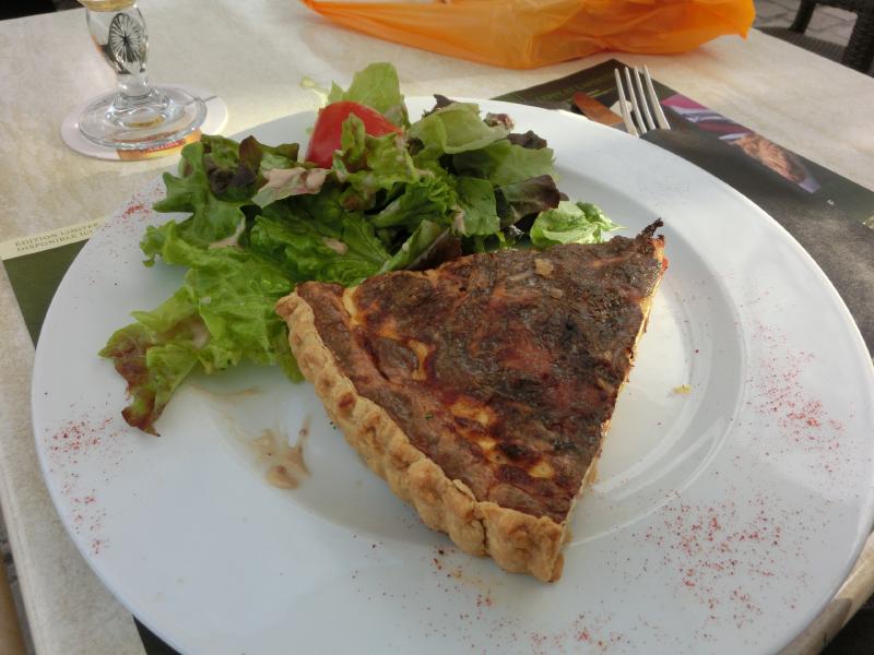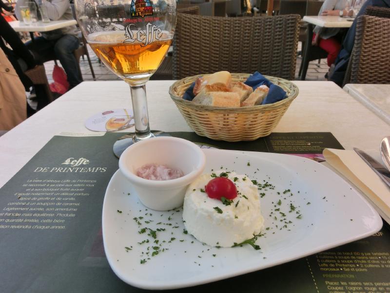 今までのドイツビールから、ベルギービールに変わったぞ。黄金色のStella Artoisと琥珀色のLeffe、どちらも飲みやすくておいしいです。そんなにお腹が減っているわけではないが、久しぶりに生野菜をしっかり食べたい。というわけで、サラダニソワーズをいただく。サラダとはいえ、ゆで卵やアンチョビが入っているのでちゃんと食べ応えがあり、黒オリーブがビールにあう。いいですね。もう一品はこの地方の名物、キッシュドロレーヌだ。正直あまり得意な料理ではないが、名物なので頂きましょう。玉ねぎやベーコンが入っていて、まあ想像通りかな。広場の景色を見ながら、ゆったりとした時間を楽しみましょう。デザートにはチーズ。思ったよりはかなりフレッシュなチーズで、さっぱりしておいしいぞ。フランスでの最初の食事、満足しました(40E)。