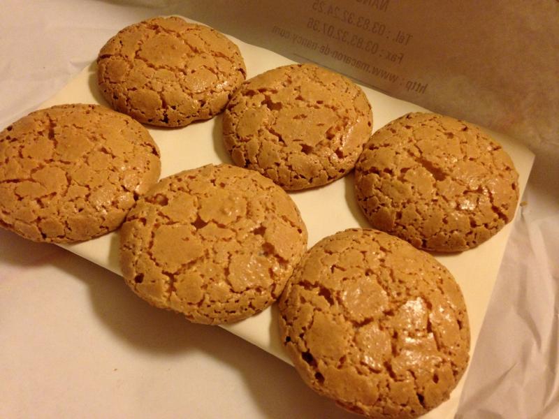 マカロンと言ってもパリ風のピンクやら黄緑やら水色やら紫といった不気味なものではなく、見た目は蕎麦ぼうろのような素朴なマカロンがナンシー風。Maison des soeur macaronsという有名なお店があるので、目指して歩く。駅前は少し標高が高くなっているのか、緩やかな坂道を下りていくようだ。ここナンシーは学生の多い町のようで、大学の横を歩いていく。歴史のありそうな建物が校舎になっているようで、いい感じですね。しばらく歩いたところで、マカロンやさん発見。早速中に入ると、フランスの伝統的なお菓子がいろいろある中にマカロンを発見。焼きたてで、シートについた状態のまま売られているのだ。1ダースの箱入りがあるので、それをいただきましょう。シートに並んだ12個のマカロン、そのシートを折り返して箱詰めされ、リボンをかけていただきました。これが買えればナンシー訪問の半分は目的達成したようなもの、あとでいただきましょう(8E)。