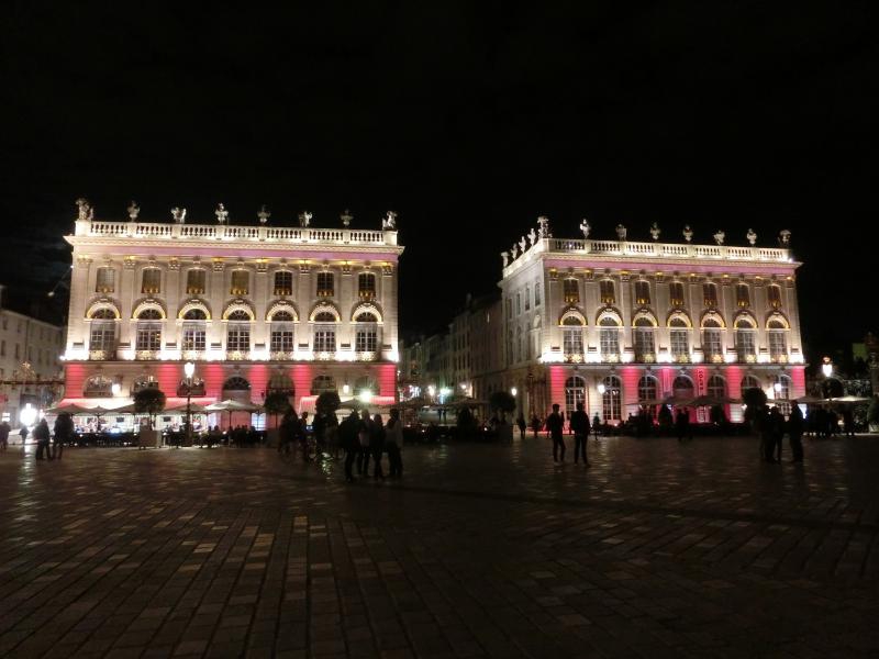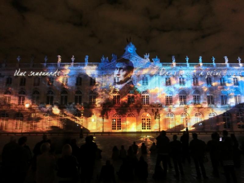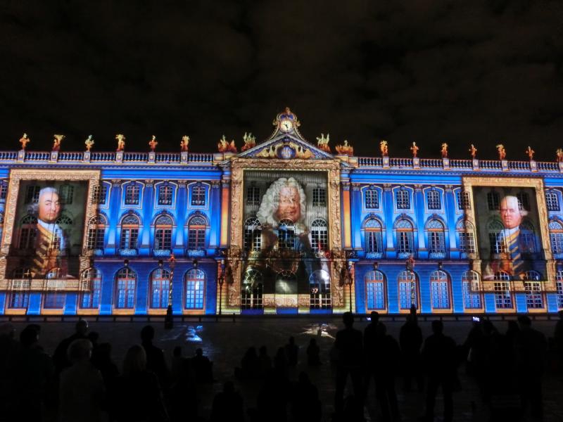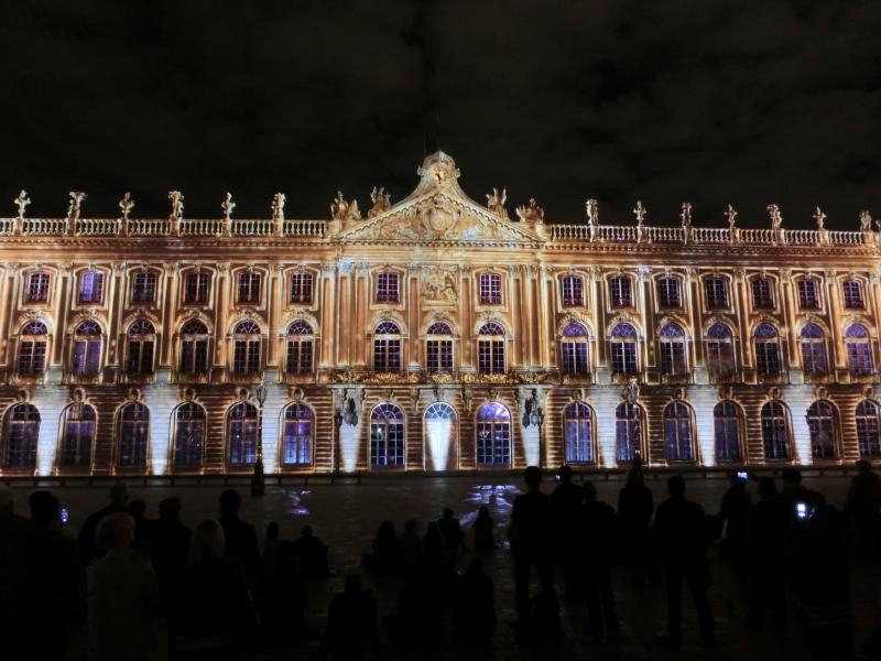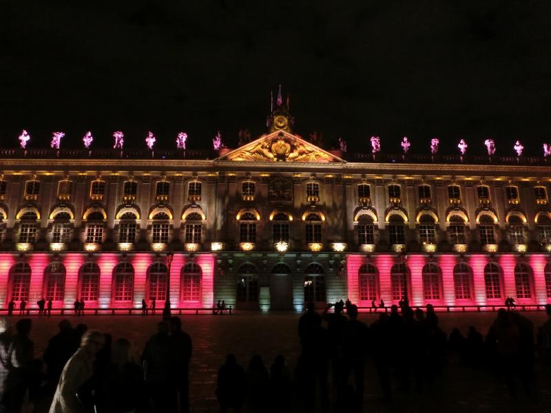 スタニスラス広場に着くと、広場に面した建物がライトアップされている。下半分がピンク色できれいだな。まもなく始まる音と光のショーに備え、たくさんの人が広場に集まっている。市庁舎がよく見えるよう、スタニスラス公の像のすぐ前に陣取り、準備完了。22時になり、しばらくするとライトアップがはっきりしてきて、音楽が始まった。そしてここからは音と光のショー。ナンシーの歴史を表しているようで、スタニスラス公や広場を設計したエマニュエル・エレがまず表示され、その後は市庁舎の建築の様子が表現される。あとはおそらくナンシーの著名人だったり戦争の頃の様子であったり、市庁舎の形状を利用したショーが次々と行われる。さまざまな色や効果で、見るものを飽きさせないような演出がすばらしい。