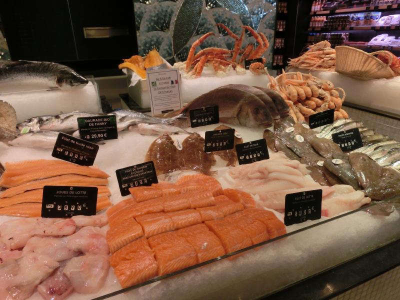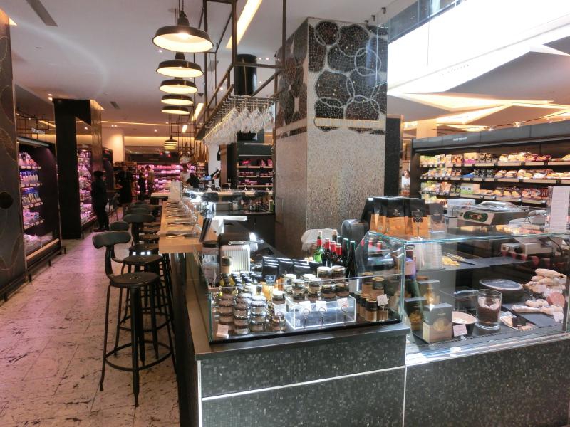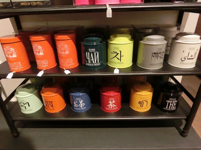 魚屋や肉屋、惣菜屋などそれぞれのお店ごとに軽く食べられる場所ができているようだ。なんとも魅力的ではないか。あとで何かいただくとして、食料品以外のフロアにも行ってみよう。2階より上にはキッチン用品や家具などが売られているのだが、ボンマルシェのエコバッグを買ったりしながらざっと見て回る(9E)。お茶屋があったのだが、いろんな言葉で「茶」を意味する文字が書かれた缶がちょっといい感じかな。日本語は「茶」ではなく丁寧に「お茶」と表記されているのが面白い。