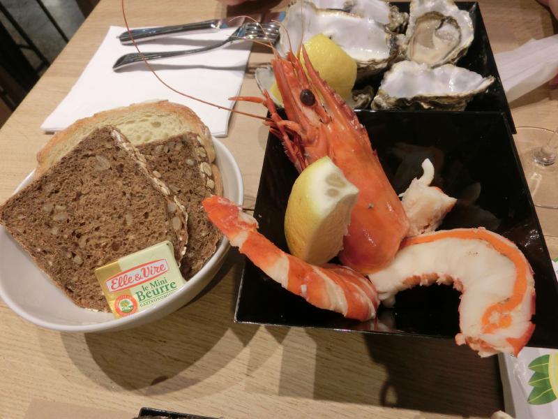 そろそろ小腹がすいたころ。昨日生牡蠣は食べたが、せっかくなのでここでもいただきましょうか。値段的にも昨日と変わらないし、牡蠣以外のメニューもいろいろとあるようだ。ということで、牡蠣を1ダースと海老をいただきましょう。牡蠣はジラルドー産のものとウタビーチ産のもの。どちらも海の香りがたっぷりで、レモンを絞ってさっぱりといただく。これはうまいねえ。海老はゆでた大海老とやらで、なかなかのボリュームだ。こちらもレモン風味だけで十分おいしくいただける。ブルゴーニュの白ワインとともに、ゆったりとした時間をすごしました(55E)。
