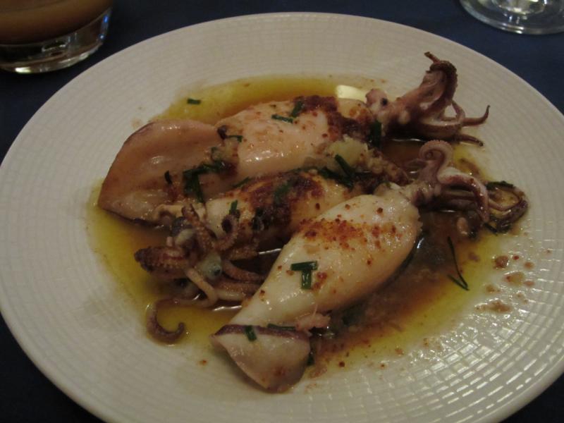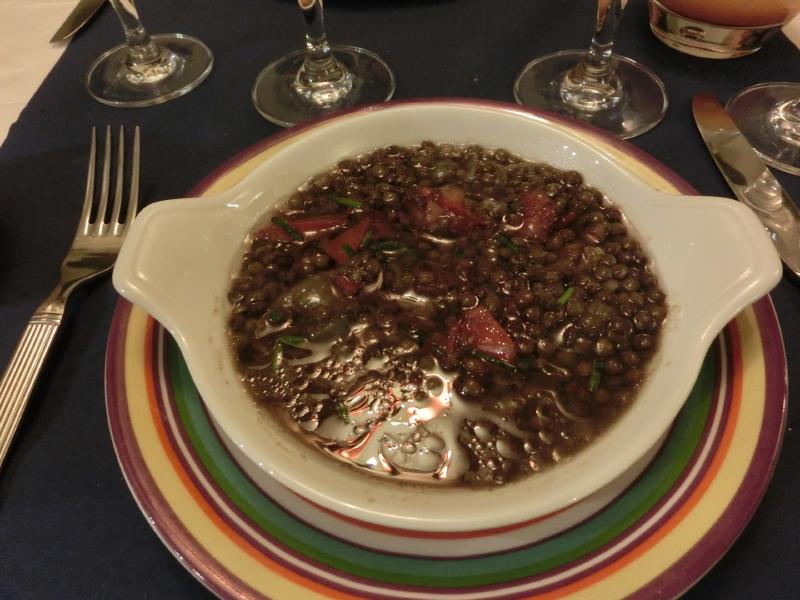 そして席に着くと、そのご主人が今日のメニューを黒板を示しながら詳しく説明してくれた。食前酒に進められたのは、Planteur de Martine。ラムベースでオレンジやグアバなどの入った南国風の味わいだ。果物なので飲みやすく、これからのディナーが楽しみだ。まず前菜として選んだのは、レンズ豆のサラダとイカのハーブソテー。レンズ豆は日本ではあまり食べることがないので、一度ちゃんと食べてみたかった。少し酸味があってマリネのようになっていて、少し残る豆の食感がいい感じで、おいしいです。イカはオリーブオイルとハーブでソテーされていて、海の風味がとてもうまい。