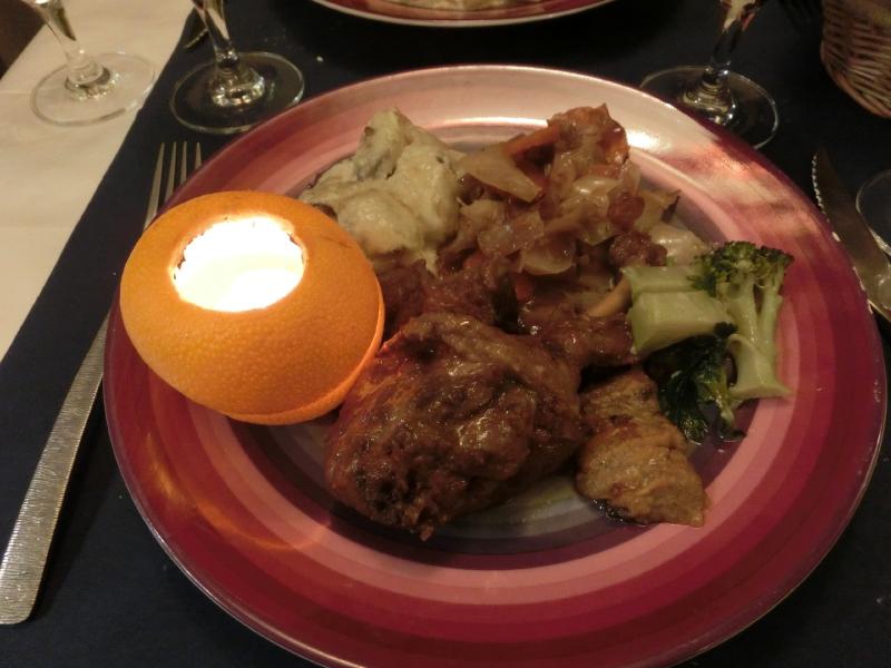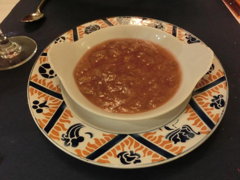 いやあ、いいですね。いつの間にかお店はいっぱいになっていて、その都度ご主人は料理の説明を細かく行っている。前菜に温かいマンステールチーズを選んでいる人が結構多いなあ。わりと匂いの強いチーズだよね。また機会があったら食べてみようかな。次はメインがきたぞ。これは2人とも同じ、鴨のオレンジソース。やっぱりパリにきたらこれを食べたいよね。しっかりした鴨肉にオレンジ風味のソースが絡んでいて、付け合せの野菜がたっぷりだ。オレンジの皮を利用したキャンドルもお洒落ですね。赤ワインをいただき、鴨肉とのマリアージュを楽しみましょう。食後にはデザートを薦められた。どうしようかと思ったが、せっかくなのでひとつをシェアしましょうか。クリームブリュレがよく頼まれていて、焼きゴテで最後仕上げるという本格的なものだが、サイズもなかなかのものだし違うものにしましょうか。せっかくなので日本ではあまり食べる機会のないリュバーブのコンポートにしましょうか。巨大なフキのようなものだが、煮込まれてとろとろになっているので、繊維質の食感が甘酸っぱい中に残っているという感じで、なかなか面白いデザートだね。どれもおいしく、お店の雰囲気もよく、大満足です(86.5E)。