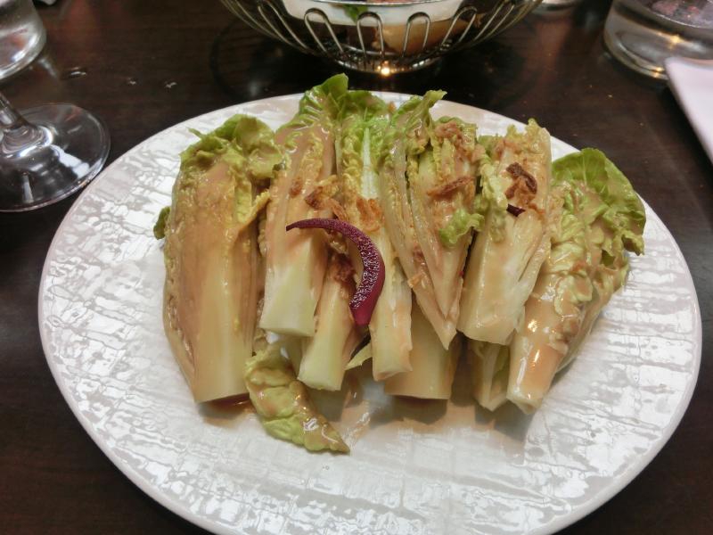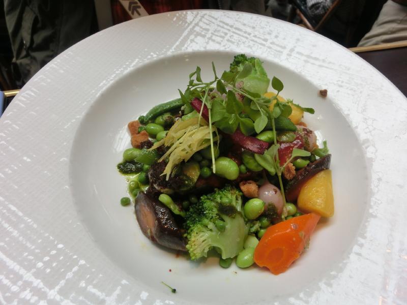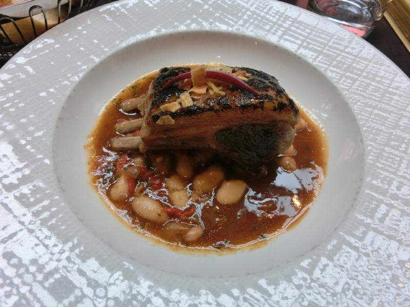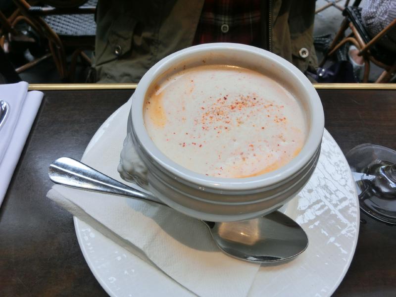 前菜とメインをそれぞれ選び、まずは赤ワインで乾杯。今日はハーフリットルなので、しっかり飲める。しばらくして、前菜が登場。ひとつはサラダ、coeur de laitueというレタスの中心部分のように見える野菜だが、これはこういうものらしい。フレッシュで食べ応えがあり、ほんのりした苦味とこのドレッシングが美味。野菜を食べたいモードだったので、おいしくいただきました。もうひとつはスープ、オマールのビスク。これは海老の風味が満載で、実にうまい。パンとあわせて食べるのもいい感じだ。さて、続いてはメイン。ひとつは羊の塊をそのまま煮込んだような感じで、脂がとろとろになっている。羊の香りを感じながら、おいしくいただく。もうひとつはマグロのグリル。たくさんの季節の野菜が一緒になっていて、これも食べ応えのある一品。どれもおいしかったです。食後に、デザートはどうかと聞いてくる。せっかくなので、リンゴのタルトをいただきましょうか。これがさすがパリ。こういうのがおいしいのです。リンゴの甘みと酸味、パイの食感、アイスクリームとの相性、どれをとってもうまい。デザートまで食べて、満足です。ごちそうさまでした(97E)。