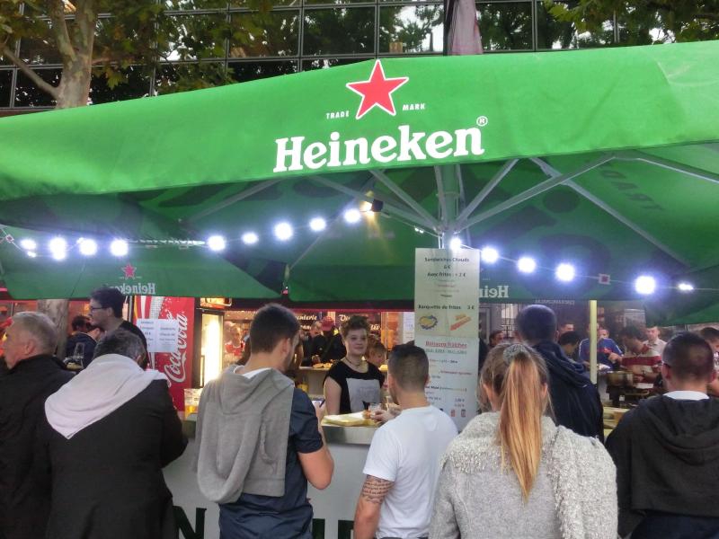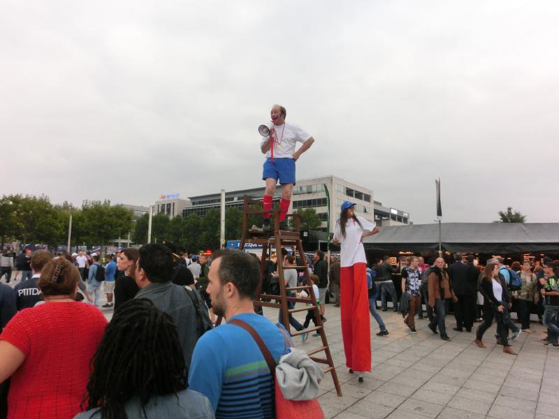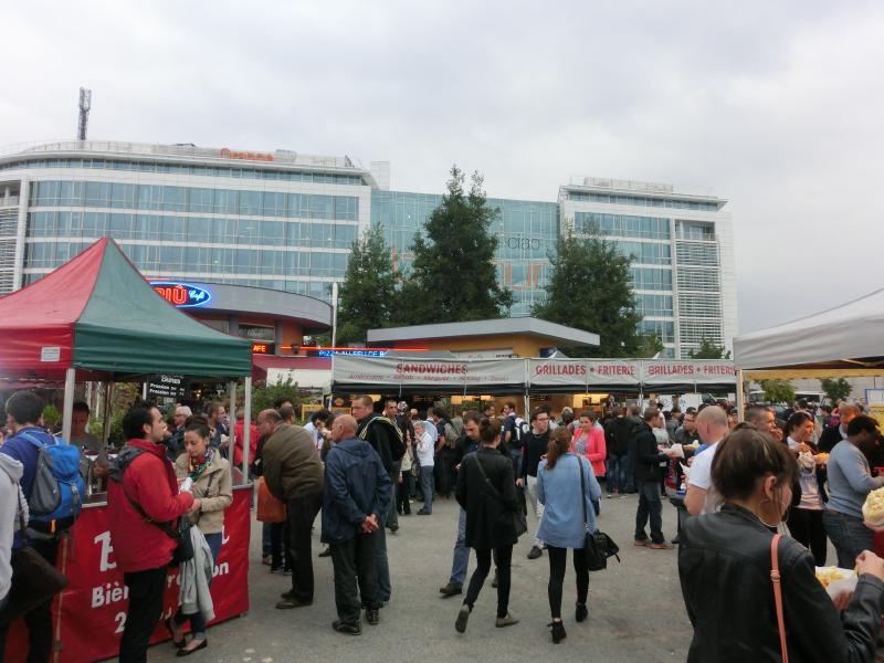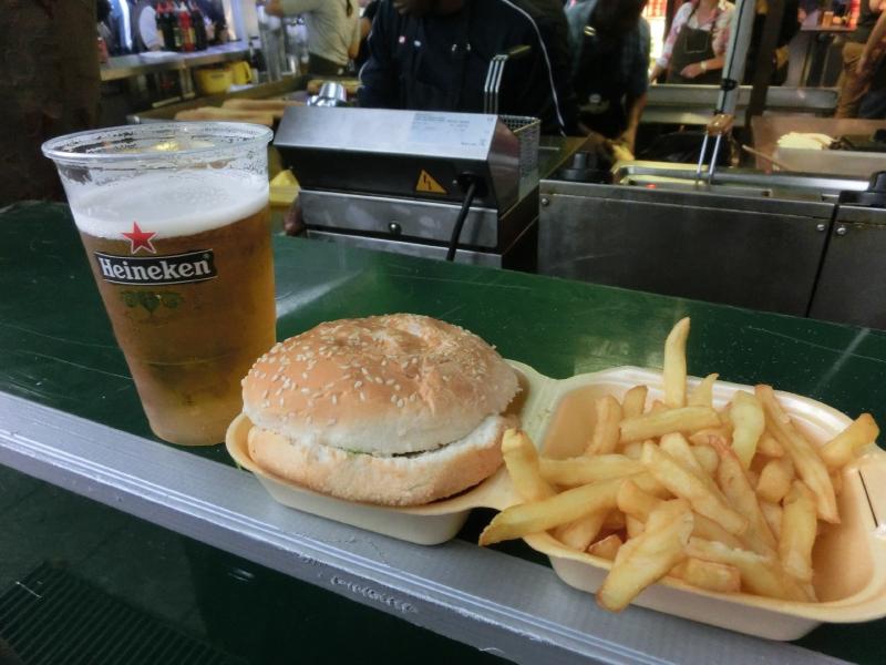 このあたりで食べておきましょう。ドイツならば基本ソーセージなのだが、フランスなのでフランスパンにソーセージだったりフレンチフライだったり、いわゆるハンバーガーだったりというところかな。頼み方もよくわからなかったので、ビールとハンバーガーをゲット。なんだか時間がかかったが、たっぷりのフレンチフライとともに出来上がりました(15E)。味としてはまあまあ、ドイツのソーセージのほうがおいしかったし安かったな。とりあえず腹ごなしもできたし、そろそろスタジアムに入ろう。それにしてもたくさんの人がいて、そんな中を警備の人が馬に乗っているのだが、馬が出すものがそのあたりに転がっている。踏まないように気をつけないとだが、日本だと落ちないようにすると思うけどね。