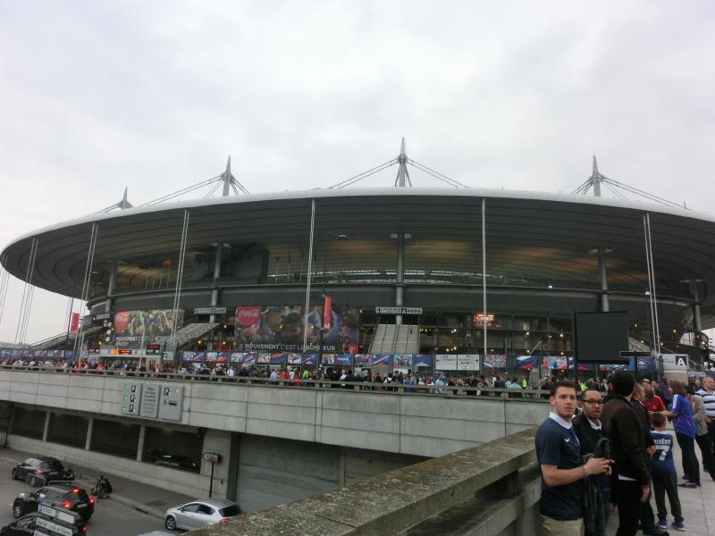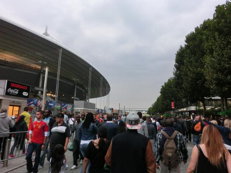 結構寝たかな。そろそろ行きましょう。ホテルを出て、スタジアムへと向かうとユニフォームを着ている人がずいぶん増えてきた。サンドニの駅に到着すると、駅前はフレンチブルーのユニフォームの人でいっぱいだ。ソーセージやフレンチフライの屋台が出ていて、人が集まっている。ざっと見ると、フレンチフライをフランスパンに挟んでサンドイッチを食べている人が結構いる。うーん、カロリーは取れるがほぼ炭水化物・・もうちょっとスタジアムに近づいてからでいいかな。人の流れに沿って歩いていくと、見えてきましたサンドニスタジアム。巨大で、圧倒される。ここで1998年のワールドカップが行われ、フランス対ブラジルの決勝戦が繰り広げられたかと思うとなんとも感動的だ。この辺りでは応援の声を上げている人も多く、試合にむけて盛り上がっているようだ。