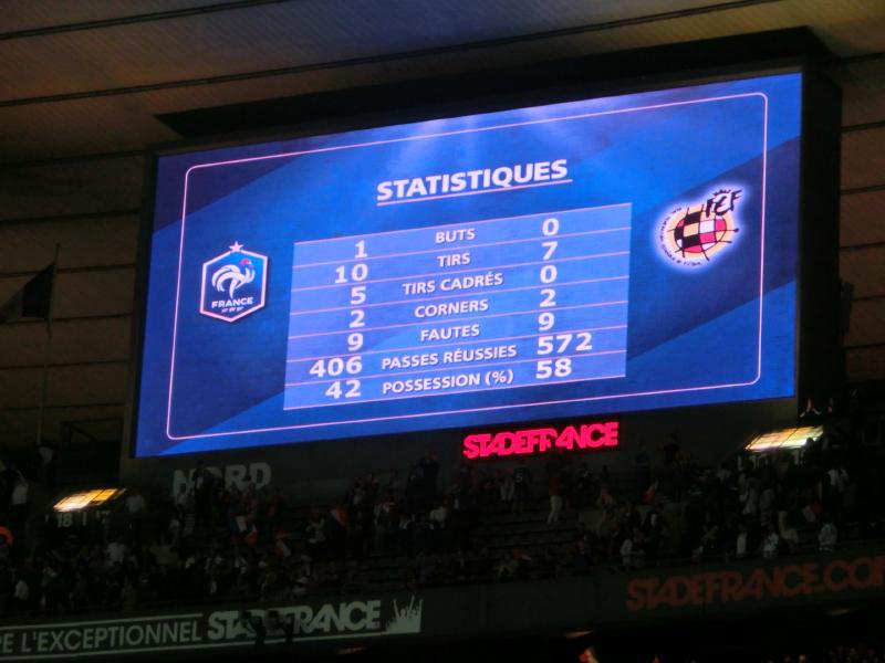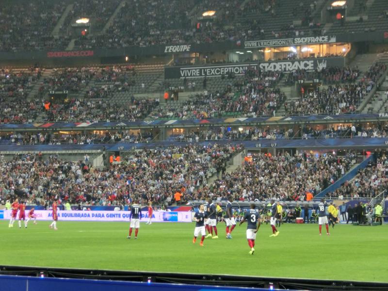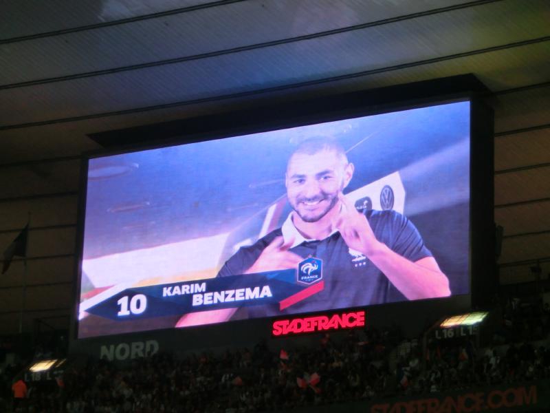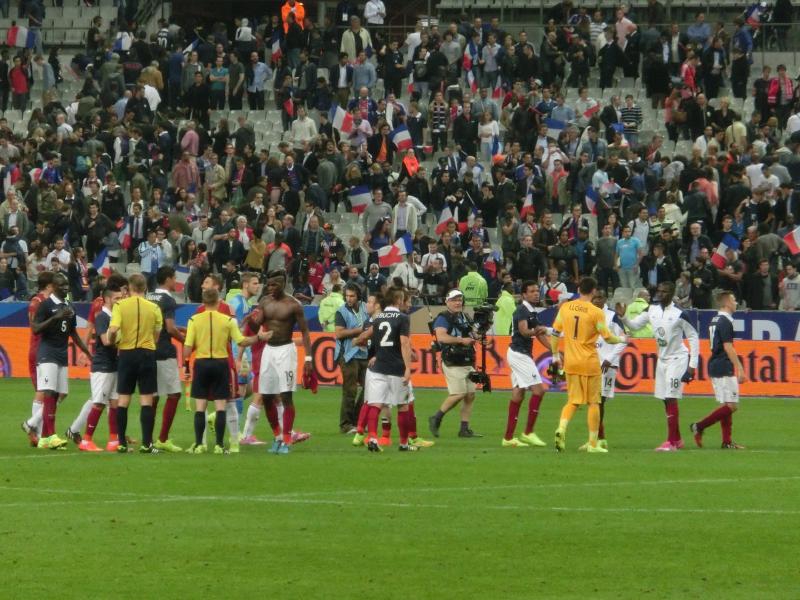 後半がスタート。開始間もない49分に、ベンゼマがゴールを決め、スタジアムが歓声に包まれたかと思ったら判定はオフサイド。途中から歓声がブーイングに変わっていきました。あとで確認したら、実はこれは審判の誤審とのことで、本当はゴールだったようです。おいおい・・・その後もフランスペースで試合は続き、73分にベンゼマからシソコ、ヴァルブエナとつながったボール中央のレミーにわたり、そのままダイレクトでシュート。ゴールの左隅に突き刺さった。その瞬間、スタジアムは割れんばかりの歓声に包まれた。今度こそゴールで、無数のフランス国旗が振られている。なんとも壮観な眺めだな。