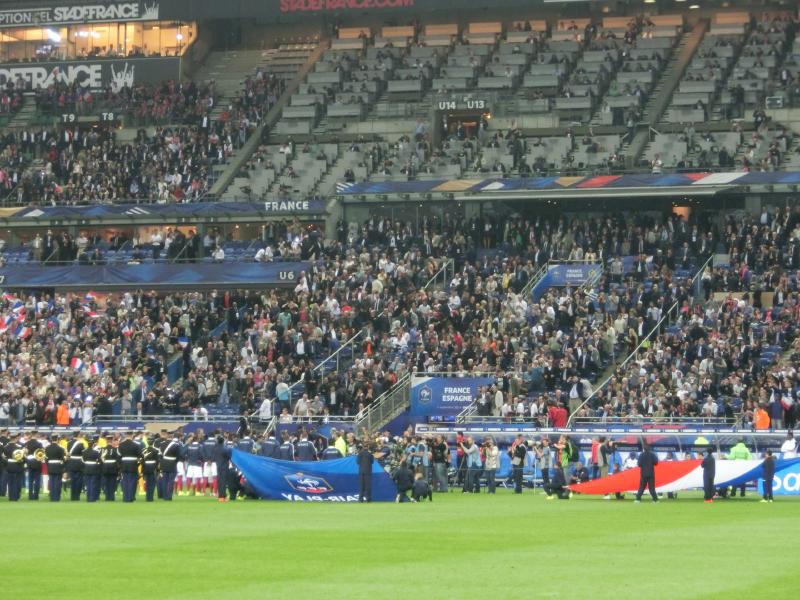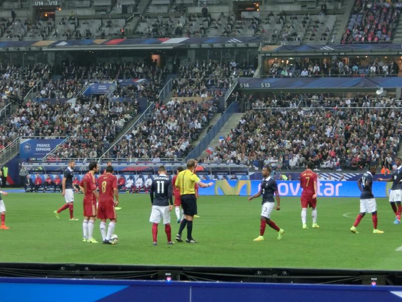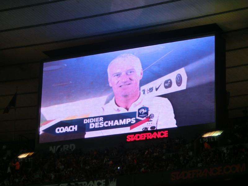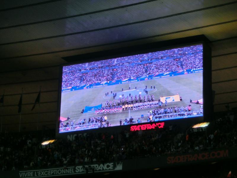 しばらくして、スターティングメンバーが発表された。スペイン側は淡々とした紹介だが、フランス側はやっぱりホーム、選手の動画をあわせて紹介し、アナウンスが名前を言った後で観客が苗字を叫ぶというのは今回の旅ではどこのスタジアムも同じ感じ。やっぱりベンゼマのときの歓声が一番大きかったかな。 あとは監督のデシャン、フランスW杯のキャプテンだよね。その後選手が入場し、国家斉唱。スタジアム全体でフランス国歌が響くのは迫力がある。