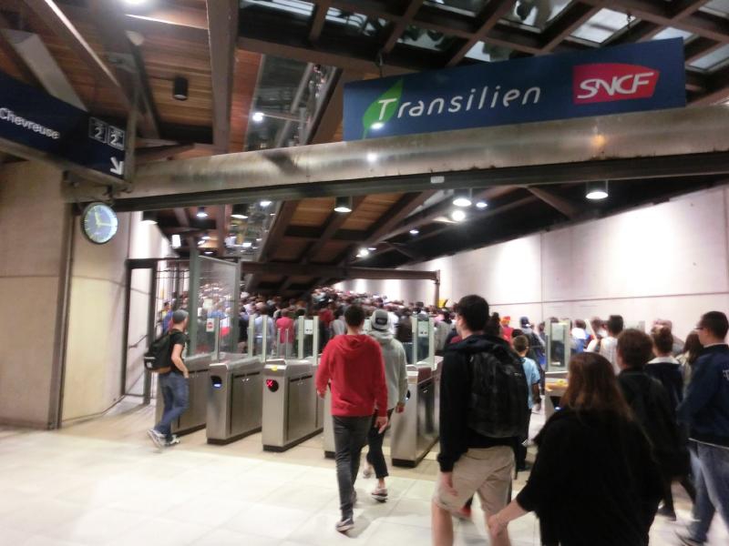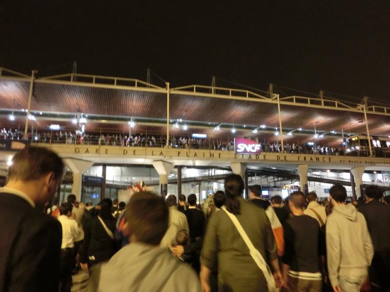 ホテルに戻り、荷物を受け取る。では行きますか。便利なところにあるホテルなので、また機会があれば泊まりたいです。さあて、荷物が重くなっているぞ。今日はサンドニでのサッカー観戦で遅くなるので、近くのホテルへと移動だ。オデオン駅から地下鉄4号線に乗り、北駅へと向かう。ここからRERに乗り換えるのだが、久しぶりでよくわからない。でもなんとか券売機でチケットをゲットし、RERの乗り場へ。地下に降りると、なんだか見覚えのある場所だな。ちょっと薄暗くて人が多くて、そういえばこんな感じ。しばらくして電車が着たので乗ったところ、アナウンスで「空港までノンストップ~」だめじゃん!あわてて飛び降り、危ないところでした。次の電車は各駅停車なので、改めて乗り込む。フランス代表のユニフォームの人もぽつぽつといるぞ。すぐに電車は地上にでて、パリ郊外に向けて走っていく。