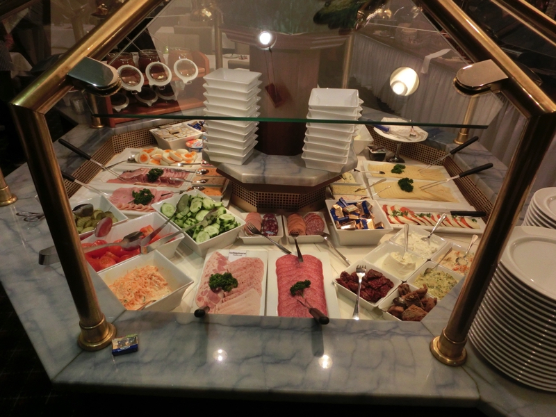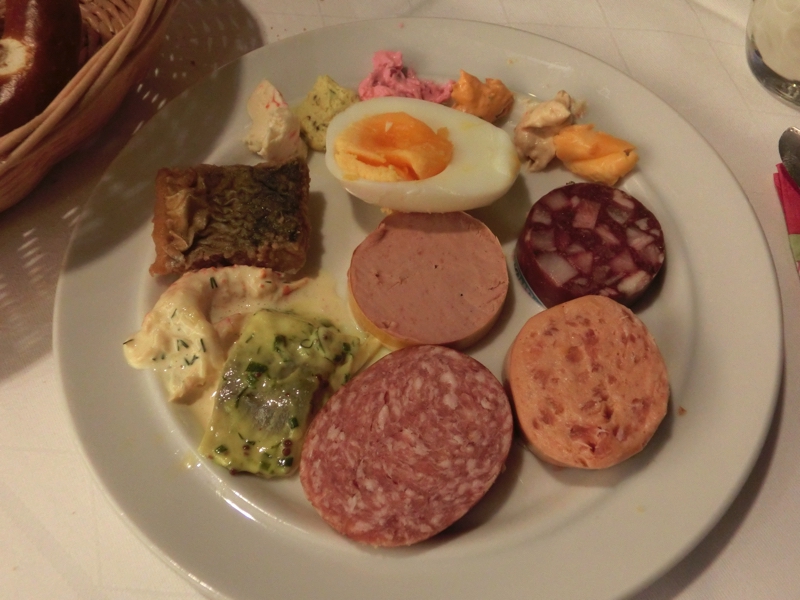 6時起床、8時前からあさごはん。ほぼこのペースで今回は来てますね。朝ごはん場所へと行くと、これはすごい。いままでにない種類の冷菜が、ところ狭しと並んでいる。ハムやチーズは定番なのでまずいただくとして、いろんな種類のクリームチーズやレバーペースト、サラミなど。せっかくなので、なるべく多くの種類をいただきましょう。パンとともにいただくが、どれもうまいです。ただ、この食生活を続けていたら明らかに塩分の過剰摂取。まあ旅行でのことだし、キュウリやトマトもたくさんいただくことで良しとしますか。温かい料理もいろんな種類のソーセージ。グリルもボイルもあるが、やっぱり白ソーセージは美味しいし、ニュルンベルガーは昨日の方が美味しかった。その土地の美味しいものがあるわけですね。ヨーグルトやキウイもいただくが、これはかなりの満腹。マーケットに行くと昼と夜が中途半端になるので、朝のしっかり栄養補給が重要だね。