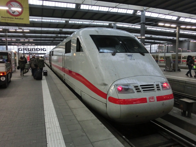 部屋に戻って荷造り。旅も終盤なので、着替えが減って洗濯物が増えてくる。お土産はシュツットガルトでいろいろ買いたいので、その分を開けておかないとね。ホテルをチェックアウト、駅前の便利なホテルでした。駅の地下街にあるレダラッハというチョコレート屋さん、日本の半分以下で買えるので家用のお土産にゲット。ではホームへと向かいましょう。シュツットガルト行きの電車はここが始発駅のようで、ホームにはすでにICEが来ていました。予約した座席がほぼ先頭なので、そこに行くまで結構時間がかかったな。出発10分くらい前に席に着き、ほっと一息。座席上にある予約表示にはMUNCHEN-STUTTGARTと表示されている。この電車はベルリンまで行くようで、隣のおじさんは終点まで行くんだね。東京-博多みたいなものかな。定刻になり、電車は静かに出発。曇り空で景色は今ひとつだが、約2時間の旅、楽しみましょう。