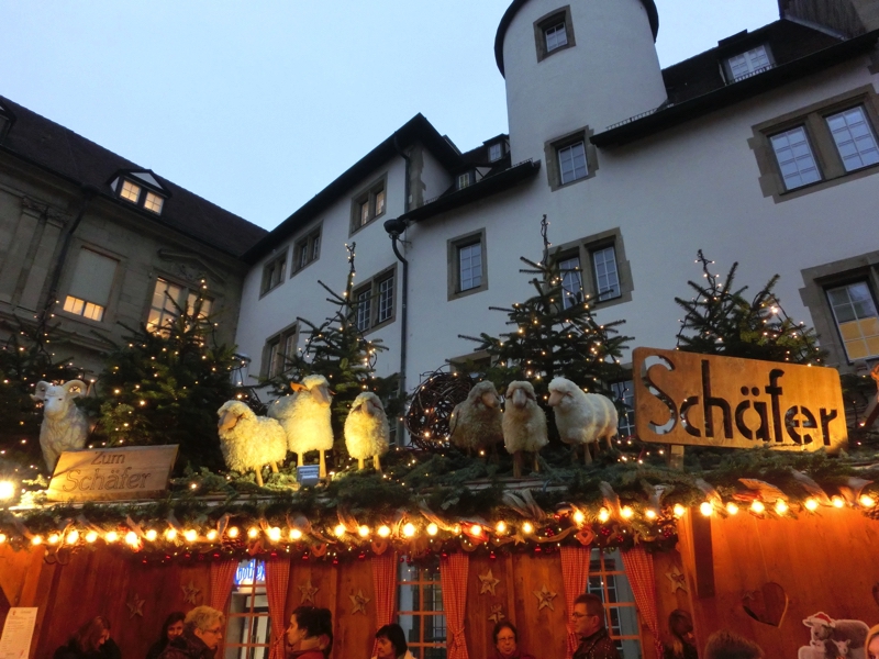 とりあえず、まずは広場近くにある市場へと向かう。Markthalleというこの場所は、どうやら100周年記念の歴史ある市場。地元の人が利用するところかな。ハムやチーズ、お惣菜や野菜など、たくさんの食料品が売っている。まあでも、ちょっとここで買えるものはないかな。市場を出ると、なぜか囲われた中に羊やロバが。これもキリスト教の決まりごとなんだろう。小さいのもいて、単純に可愛いけどね。