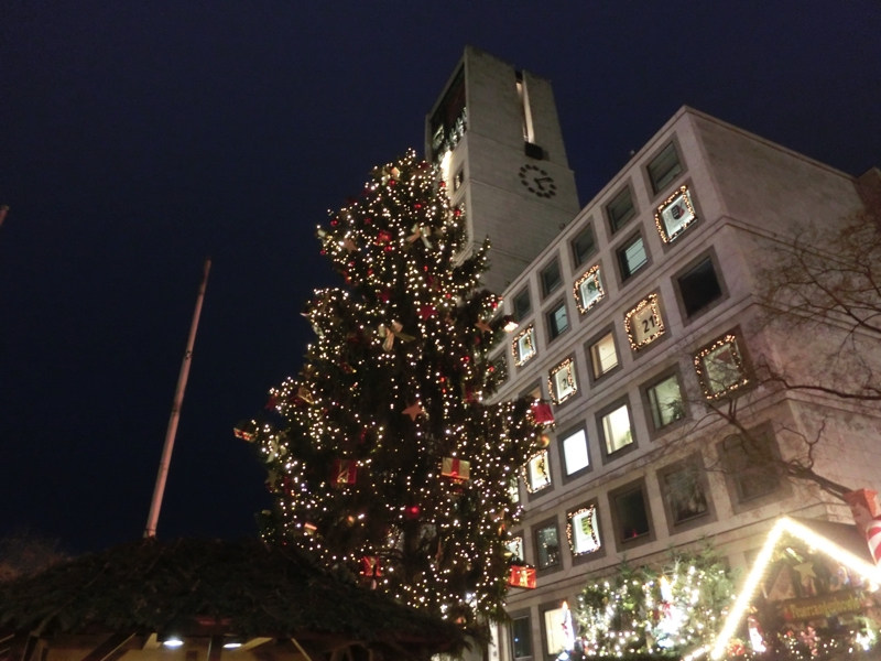 そしてその先にあるのがマルクト広場。ここもクリスマスマーケットのメイン会場で、たくさんのお店が出ている。まずはグリューワインかな。ここはいろんなカップがあり、好きなものを選べるようだ。中が赤色の白カップがいい感じなので、これにしましょうか(5.5)。各都市のグリューワインは、ワインがミュンヘン4、他は3。カップはローテンブルグ1.5、シュツットガルトが2.5、他は3。大都市はちょっと高めかな。ワインそのものの味といえば、どこも変わらずスパイシーで美味しい。今日は寒さは少しましだが、それでも指先が冷たくなるのでこれで温まろう。