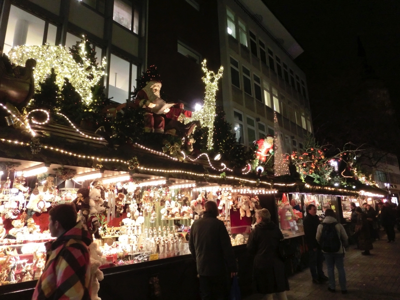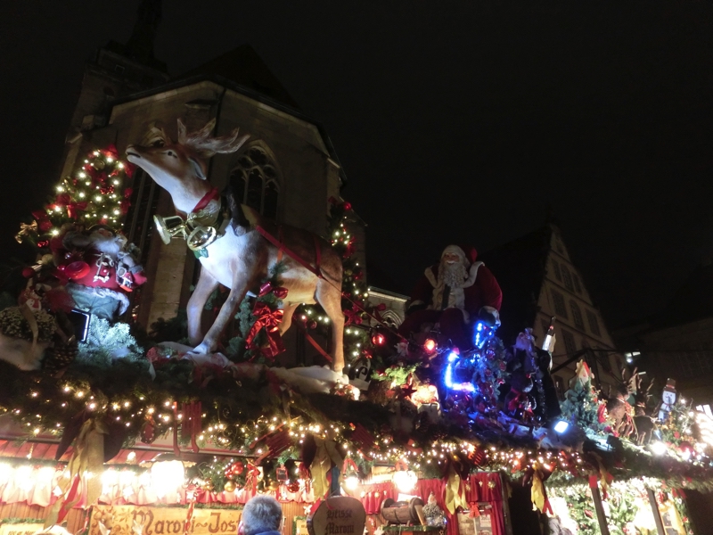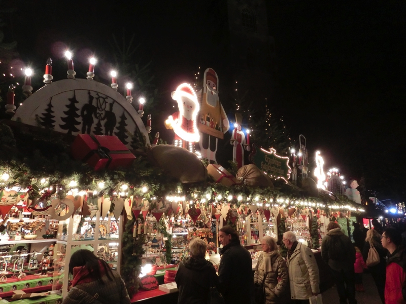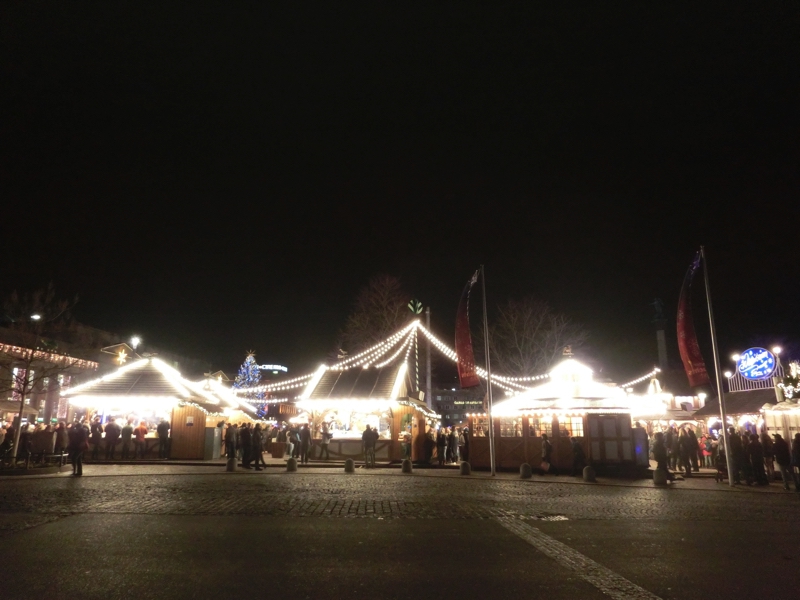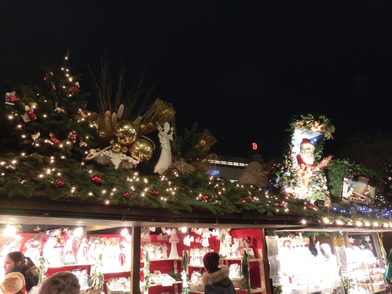 そろそろ16時。日没も近いし、出かけますか。まずは駅近くあるREWEというスーパーに行ってみる。バターを買いたいが、どうやらドイツ製は無塩が多く、ここでは有塩のがあるかどうかが今ひとつよく分からない。ドイツ語の壁だな。お土産用のチョコも見てみよう。免税店でも売っているようなものではなく、ここではプライベートブランドのちょっといい感じのがあるなあ。まあ一つの候補として、ここはこんなところで。ではクリスマスマーケットへと行きますか。ちょっと道に迷いながら、到着したのは宮殿広場。メイン会場の一つで、たくさんのお店が出ていてる。ここシュツットガルトで特徴的なのはそれぞれの店の屋根にサンタクロースやトナカイなど、まるで山車かと思うような飾り付けがされていること。そんなところも楽しめる。