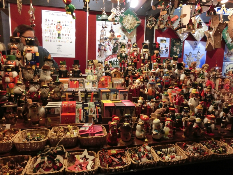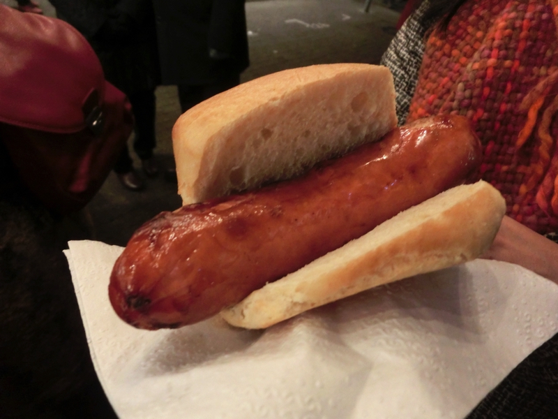 ではお店を見て回りますか。ここではお店の屋根も楽しみながらの散策なので、これも楽しいな。どのお店もクリスマスの趣向を凝らしているが、単純に可愛いものもあれば宗教色の強いもの、ちょっと怖い感じのものなどいろいろある。なにか記念品を買いたいが、なかなか気にいるものがないなあ。昨日までの4箇所で買ったものとかぶらないようにすると、サンタにトナカイに雪だるまが外れるのであとはクマ系か天使系などか。さあどうしようかな。少しお腹を満たそうか。ソーセージ屋さんで、ちょっと太めのグリルソーセージをいただきましょう。パンに挟んでいただくのだが、やっぱりうまい。もはや安定のソーセージ(3)。