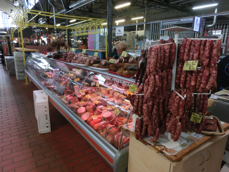 ホテルを出て旧市街に向けて歩いていくと、なにやら駅舎のような建物がありこれがハレス市場。市場となると入ってみないとね。中に入るとそこは肉や野菜などの売り場が整然とならんだきれいな市場。どこからか、いい匂いも感じることができる。入り口近くにいい感じのパン屋さんがあり、ここで見かけたのがキビナイ。いわゆるミートパイだが、試しに一つ食べてみよう。6種類くらいあるが、何が入っているのか・・聞いてみると、チキンやポーク、ラム、ホウレンソウやトマトなどがあり、ラムだと危ないところでした。無難なところでチキンにしましょうか(1.5)。チキンのひき肉が入ったパイのようで、素朴な味わいがおいしい。まずは小腹を満たしたころで、市場内を散策。この時期はイチゴやブルーベリー、チェリーなどがたっぷりと並んでいてきれいだな。自家製ピクルスなどもあり、楽しかったです。