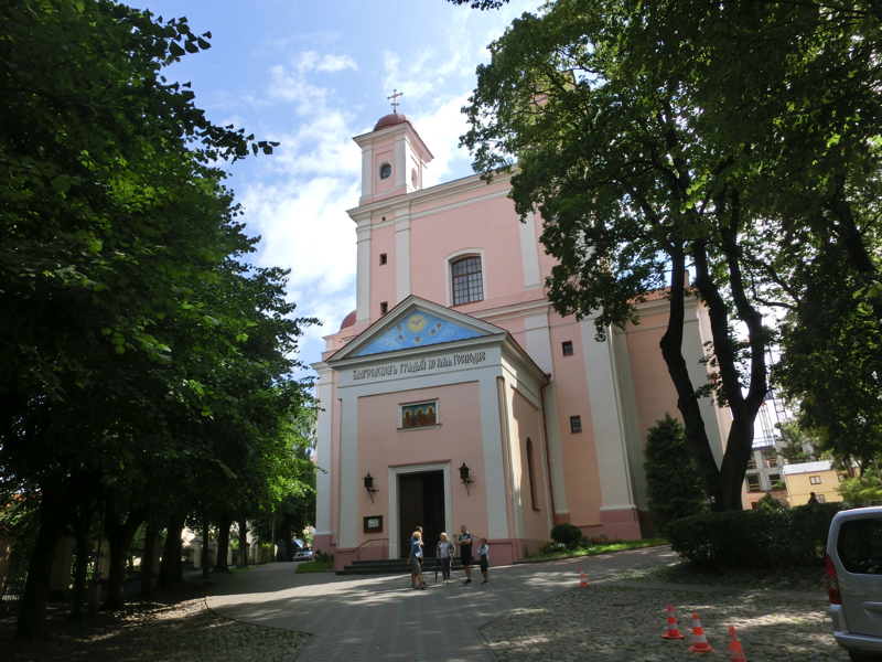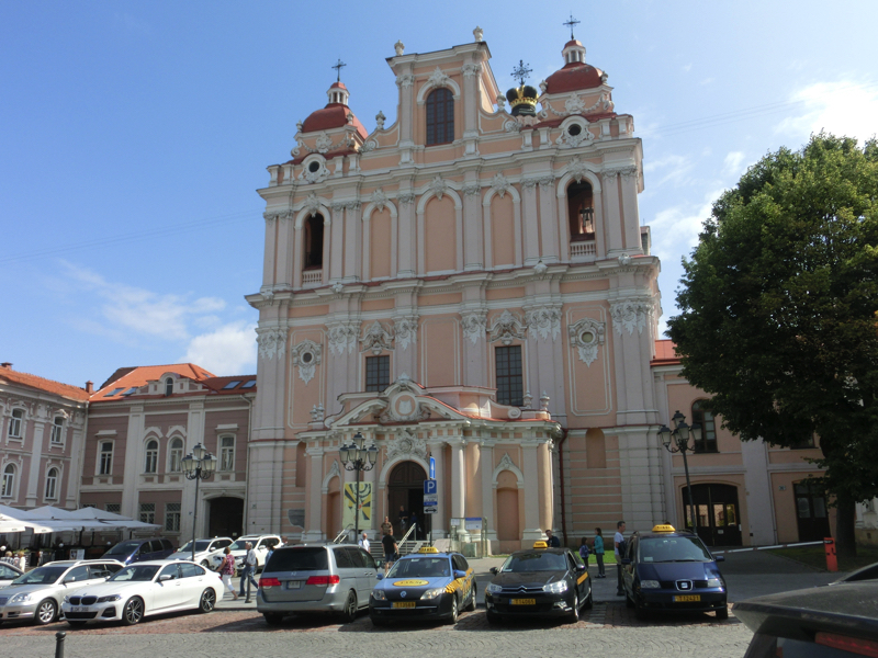 先へ進むと、聖三位一体教会の門の向かいにそびているのが聖カジミエル教会、ここはリトアニアの守護聖人を祀っているとのこと。正面から見るとサーモンピンクの壁が印象的だが、少し離れてみると最も高い塔の屋根が王冠をかぶったようになっているのが印象的。ソ連時代には博物館になったこともあったらしい。
