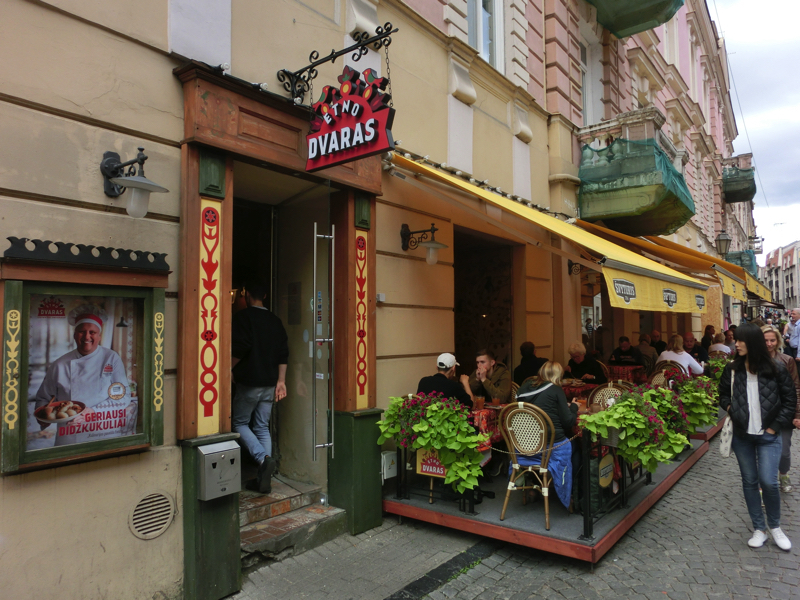 市庁舎前広場を抜け、どんどん歩こう。このあたりからは道沿いのお店も増えてくる。聖ニコラス正教会や聖殉教者教会、そしてビリニュス大学を超えて到着したのが今日の昼ごはん場所、フォルト・ドゥヴァラス。リトアニア郷土料理のお店だ。テラス席につき、リトアニアの郷土料理としてガイドブックで紹介されていた料理を頼んでみる。