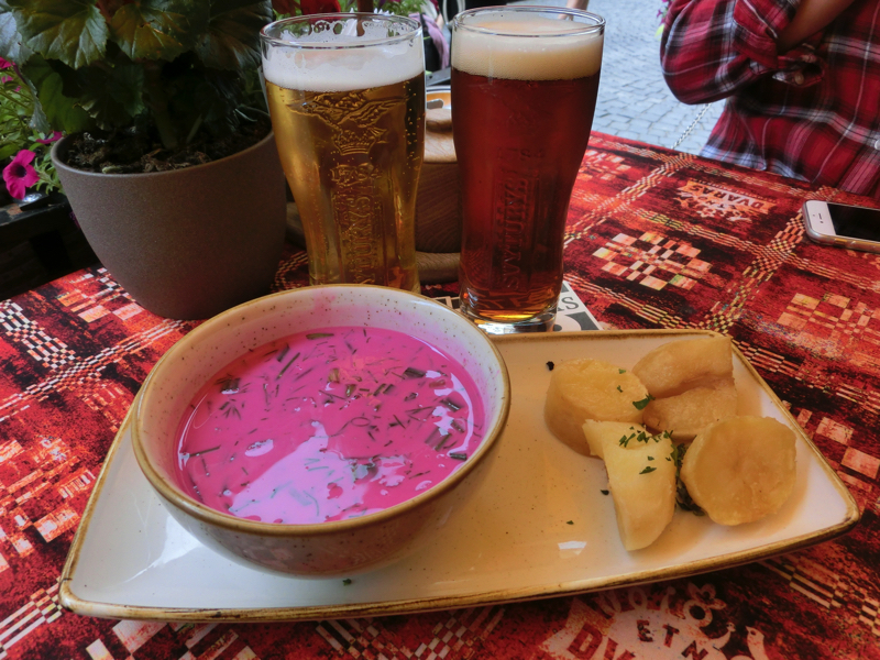 ここはリトアニア料理のお店なので、まずはリトアニアビールで乾杯、ほろ苦くておいしいビールだ。さて、最初に来たのはビーツの冷製スープ。