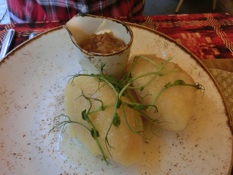 なかなか毒々しいピンク色だが、これはビーツの自然な色。味としては少し酸味があってさわやか、細かく刻まれたビーツやキュウリがおいしい。付け合わせのポテトとともに、前菜としてはいい感じです。ただ、ひとり一個だったら多かっただろうな。そしてメインが登場、まずはポテトのソーセージ。マッシュポテトが入ったソーセージとの紹介だったので、太めのソーセージの中にマッシュポテトが挟まっているようなものを想像したらこれがマッシュポテトオンリー。要するに腸詰の詰め物が肉ではなくマッシュポテトなのだ。なのでナイフで切ったり口で噛んだりするとソーセージのパリっとした感があるのだが、中身がポテト。なるほど〜素朴な郷土料理としておいしいが、これも一人で一皿となると厳しいかな・・・もう一つはツェペリナイというジャガイモ団子のようなもの。こちらは中に肉があり、つるっとしたジャガイモの食感とともにおいしくいただける。とはいえこれも一皿で2個あるので、一人一皿は厳しいな・・・リトアニアの素朴な郷土料理は、おいしいが量が多くて半分づつで心もお腹も大満足、ということで(21)。