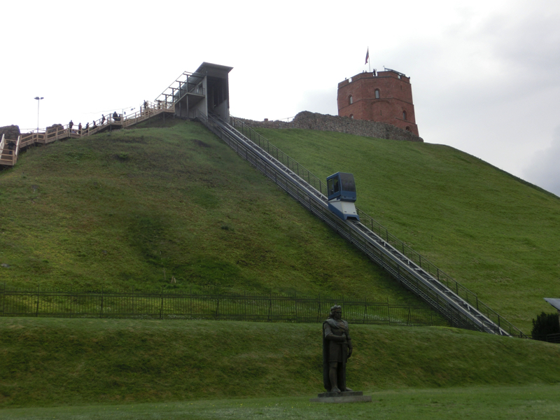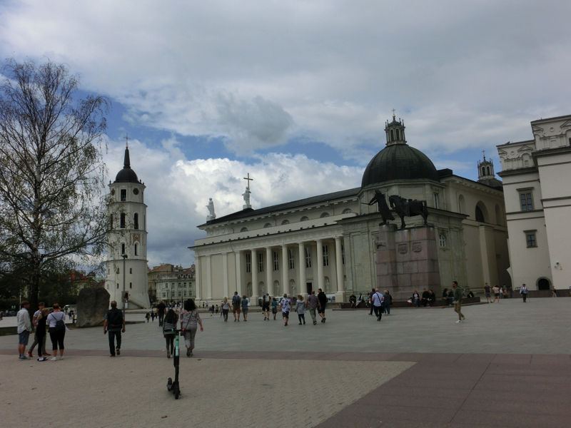 少し歩くと、大聖堂広場に到着。ここは13世紀に十字軍の侵略を防ぐために建立されたものとのこと。少し雨が降ってきたこともあり中に入ると、太い柱にそれぞれ大きな聖人の絵が飾られている。少し気が引き締まる感じがします。雨が上がったので外に出ると、大聖堂広場の真ん中あたりにちょっと色の違うところを見つけた。ここは1989年にバルト三国がソ連から独立を求めるためにヴィリニュス〜リガ〜タリンを結ぶ「人間の鎖」を作った時に、ヴィリニュス側の起点となった場所。ここには「奇跡(stebukals)」と書かれており、この上で3回転すると願いが叶うそうです。あと広場に建つのがケディミナス像、なんでもヴィリニュスの街の基礎を気づいた人物だそうで。