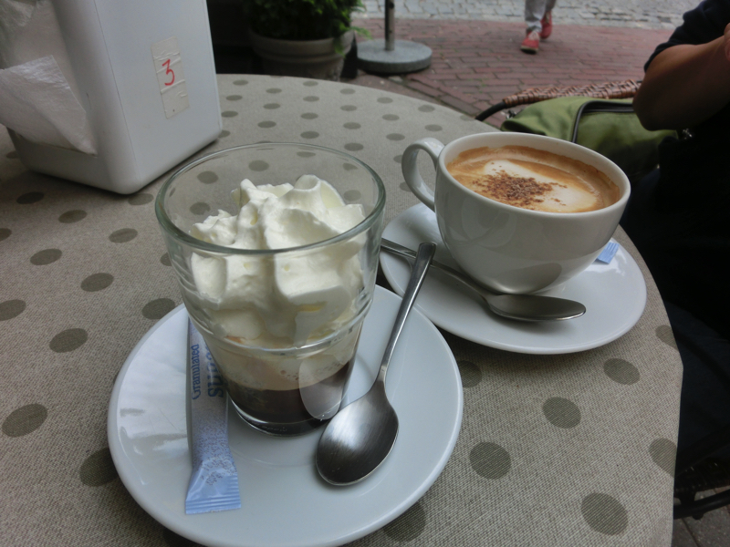 塔を降り、このあたりでカフェタイム。大聖堂広場を出て少し来た道を戻るといくつかカフェがあり、なんとなくいい感じのところに入る。テラス席が気持ちいい。ここでカプチーノとクリーム入りのエスプレッソをいただきましょう。のんびりしたひと時、いいですね(3.65)。15時を過ぎたところで、一旦ホテルに戻りますか。かなり気温は上がっているようで、日差しが強いので暑くなってきた。でもやっぱり日陰は涼しいので過ごしやすい。夜明けの門を出てホテルに戻り、部屋に入る。体は熱くなっているのに空調が無いので一瞬びっくりしたが、この辺りで冷房がないのは普通のこと。屋内は日陰だし扇風機はあるので、すぐに体も落ち着いてきました。では夕方まで、しばし休憩。