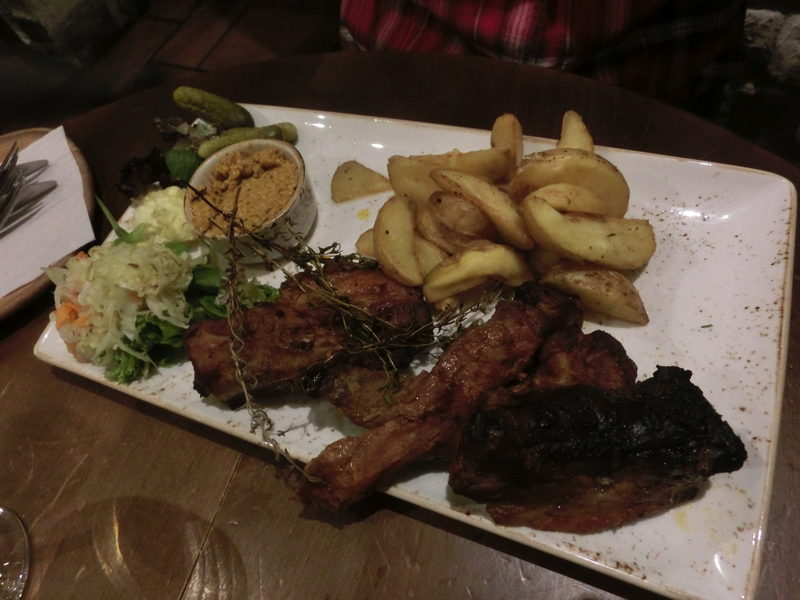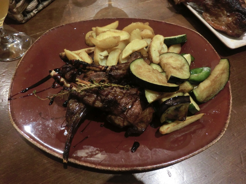 ちょうど日本人と席の入れ替わりをした感じで、少し奥の席にも日本人の団体がいる。ある程度お年を召した、旅慣れている感じの人が多いようだ。昼がマッシュポテト三昧だったので夜は肉を食べたい、ということで豚と羊のメニューをそれぞれ選ぶ。まずはリトアニアの地ビールと、名産のアップルワインで乾杯だ。その後お肉の一皿が登場。どちらもフライドポテトはたっぷりついているが、野菜のグリルやピクルスなどもありバランスはOK。羊も豚もしっかり食べ応えのある量だし、ちゃんとおいしい。昼と夜でリトアニアの料理をいろいろと満喫したな。