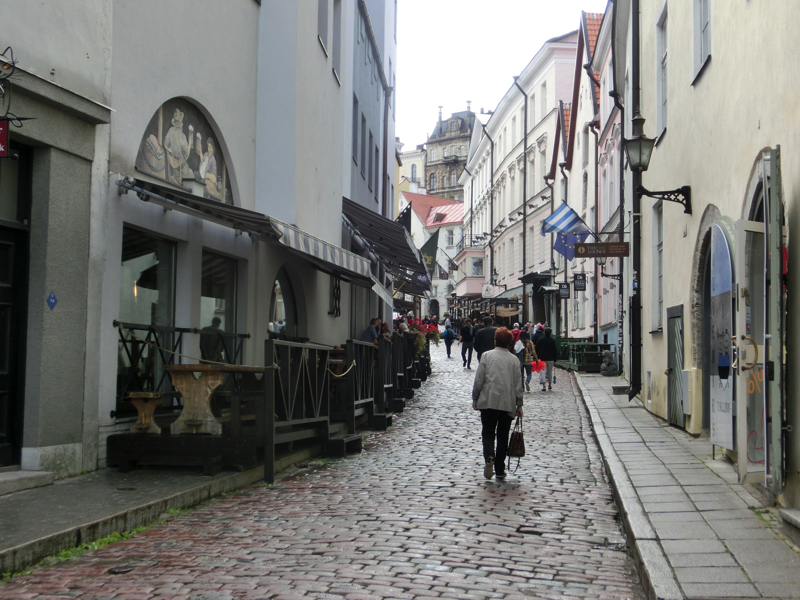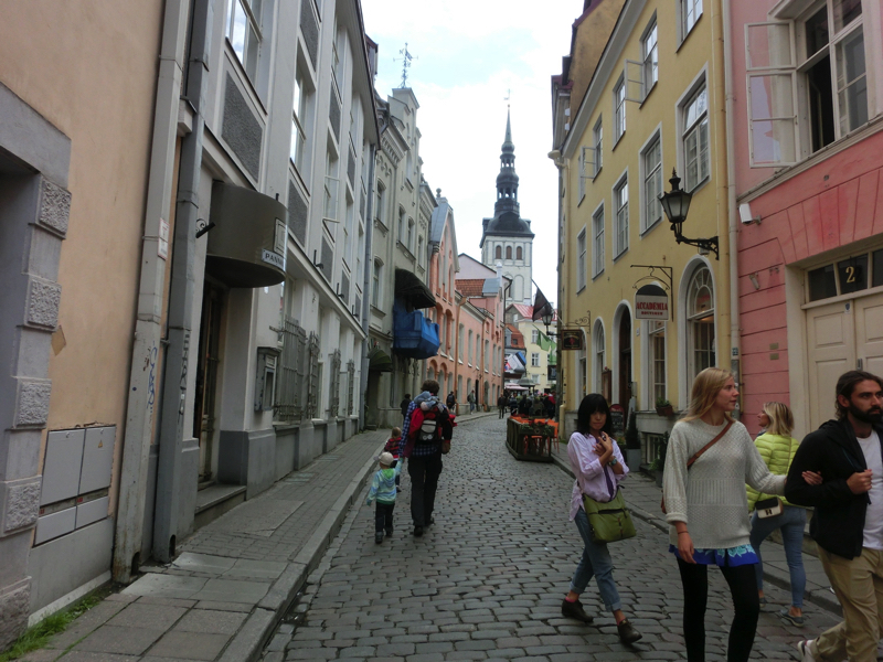 その横にある庭園に入ると、高い塔が見える。これは「のっぽのヘルマン」と呼ばれる塔で、歴代の支配者の旗が掲げられてきた。ということで、今はエストニア国旗がはためいています。庭園を出て、坂を下りると城壁があり、四角い塔は乙女の塔と呼ばれるネイツィトルン。このあたりから下町に至るエリアがデンマーク王の庭と呼ばれる場所で、細い坂道が山手と下町を結んでいる。その坂道を下りていくと聖ニコラス聖堂前に、そして賑やかな街なかへと戻ってきたぞ。
