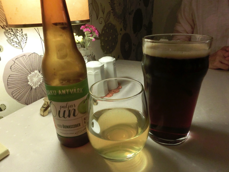 この広場を抜け、少し歩いたところのVanaema Juuresに到着。地下にあるレストランで、この中途半端な時間でもお客さんが入っている。ここで食べたいのはローストポーク、まずはエストニアのダークビールとシードルで乾杯だ。そして出てきたのが黒パン、これがしっとりした食感と自然な甘みが実に美味。ビールともよく合う。バターなしでもしっかり味わえるね。日本ではあまり食べる機会はない黒パンだが、やっぱり本場はうまいなあ。しばらくして、ローストポークが登場。肉厚な豚肉はやわらかく、付け合わせのザワークラフトの甘みとマスタードの酸味がいい感じ。噛むとほぐれるような触感がいいですね。黒いソーセージは豚の血入りだが、あっさりとしてくせがなく食べやすい。いやあ、どれもおいしかったです。ごちそうさまでした(38.6)。